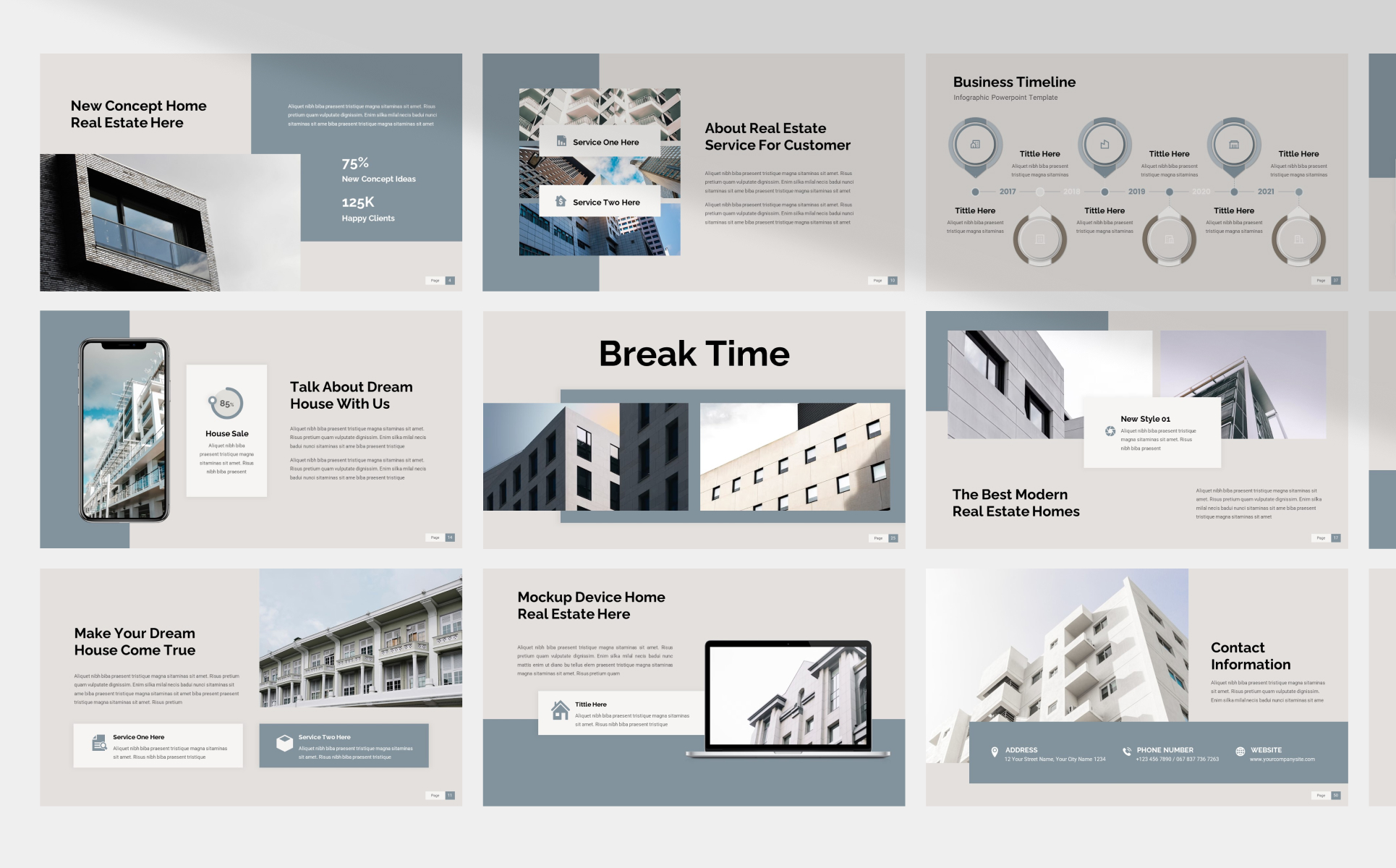 Real Estate - Presentation Template is an asset to help you make the business illustration in the media presentation easier. With a variety of modern design choices, making your presentation structure easier to understand and stylist.