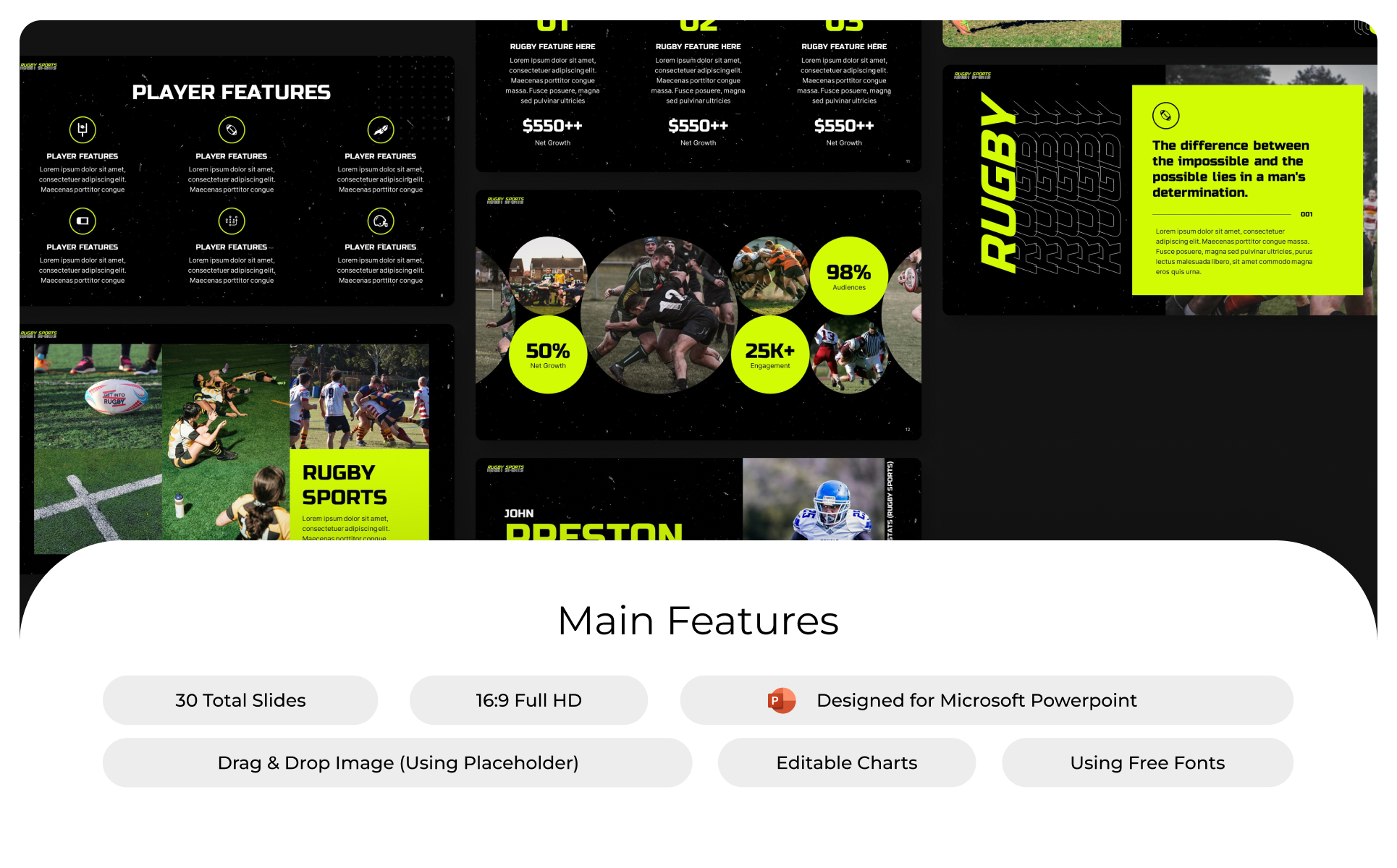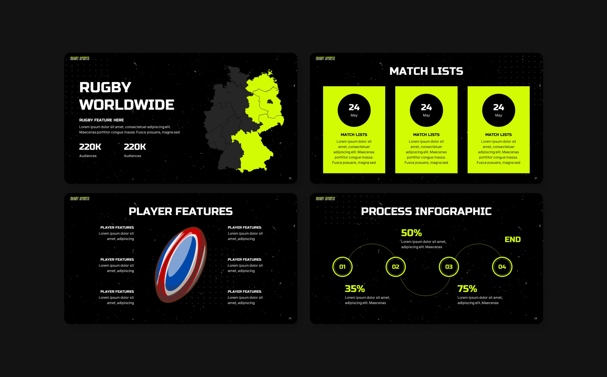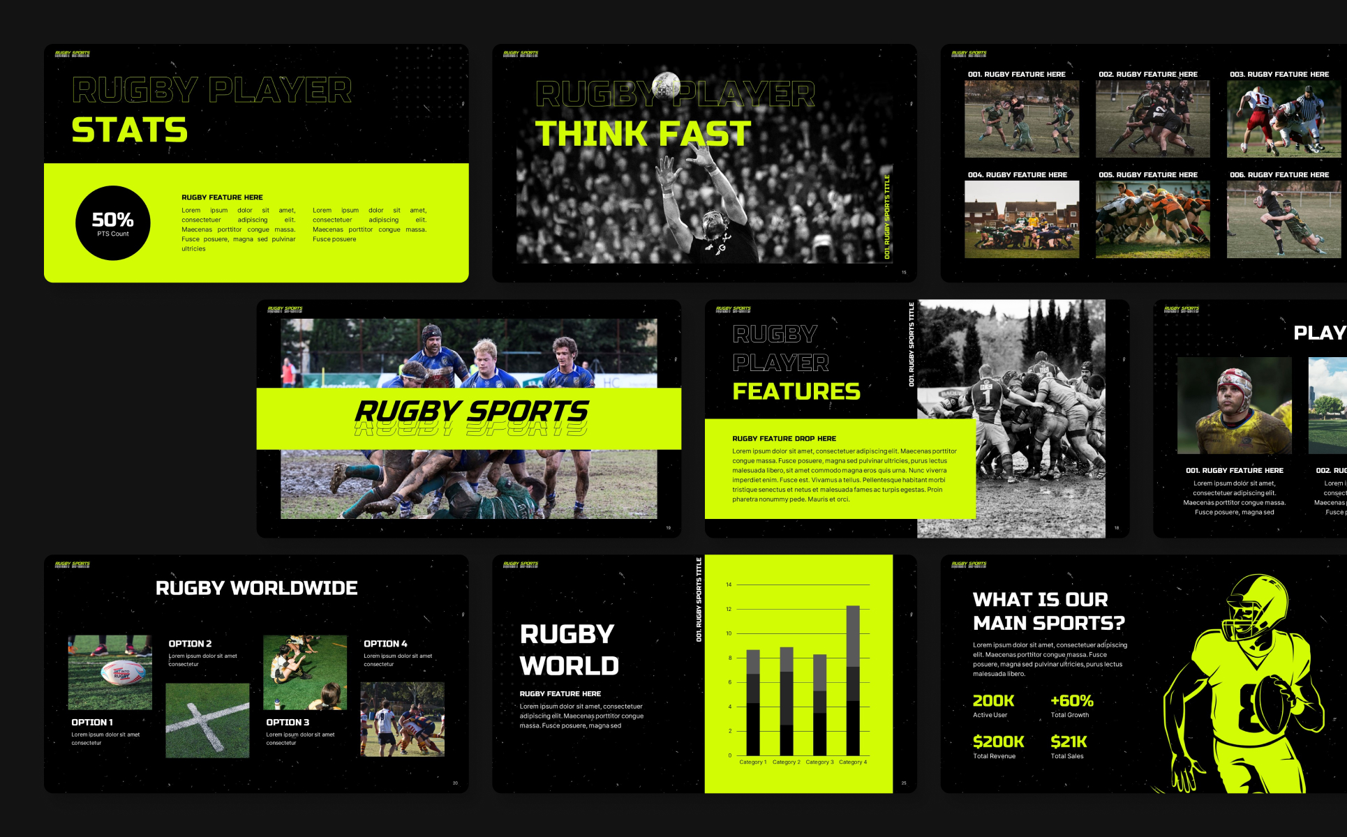 With 30 fully customizable slides, this modern presentation deck is packed with features tailored to the intensity of rugby. Highlight key players, match stats, game strategies, and training regimens with visually compelling layouts and editable graphics. Every slide is designed to capture the excitement of the sport while keeping your message clear and professional.