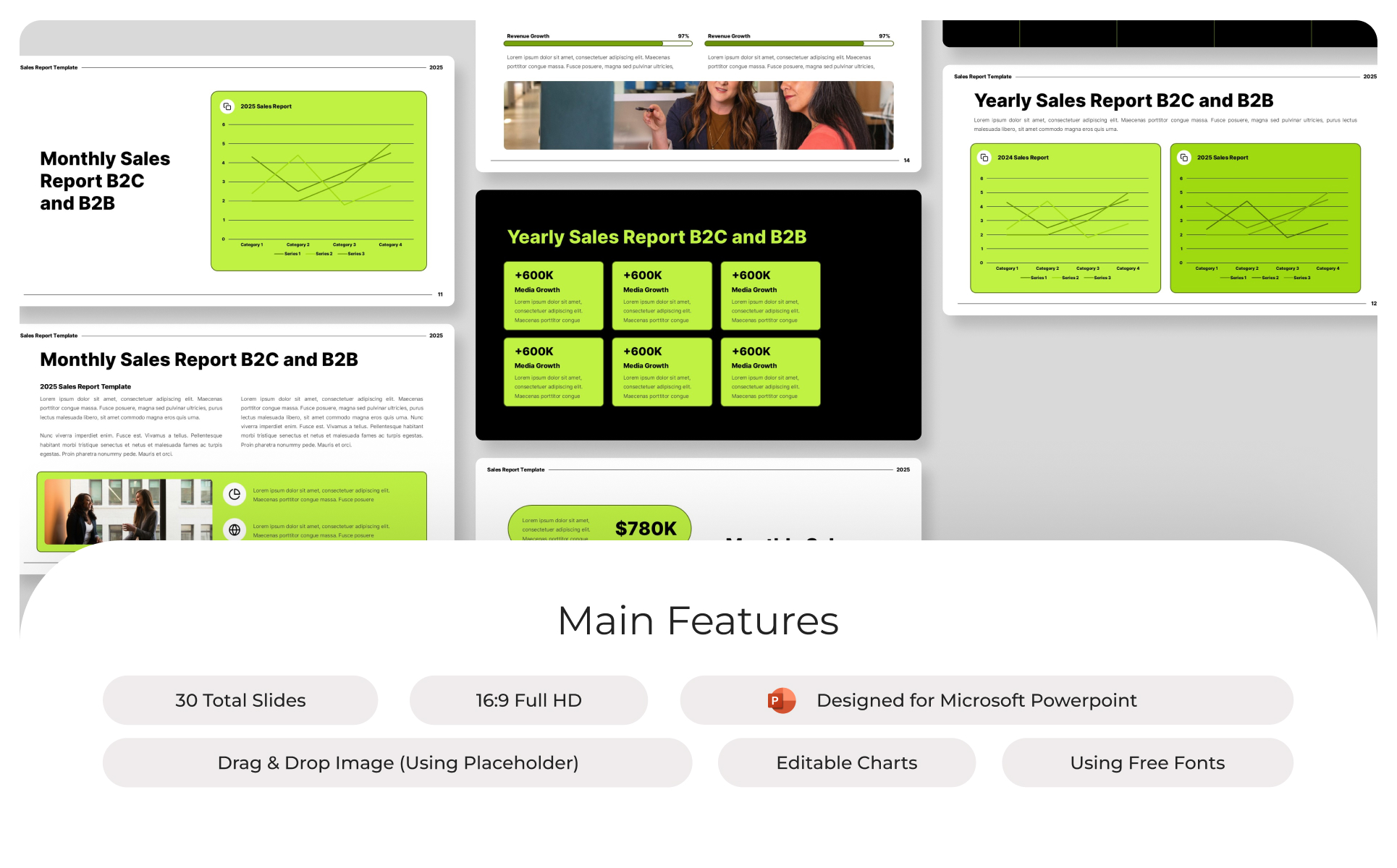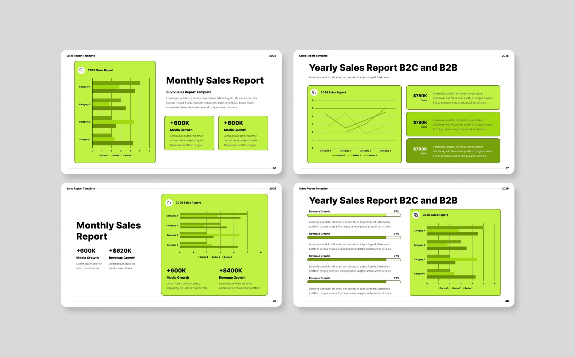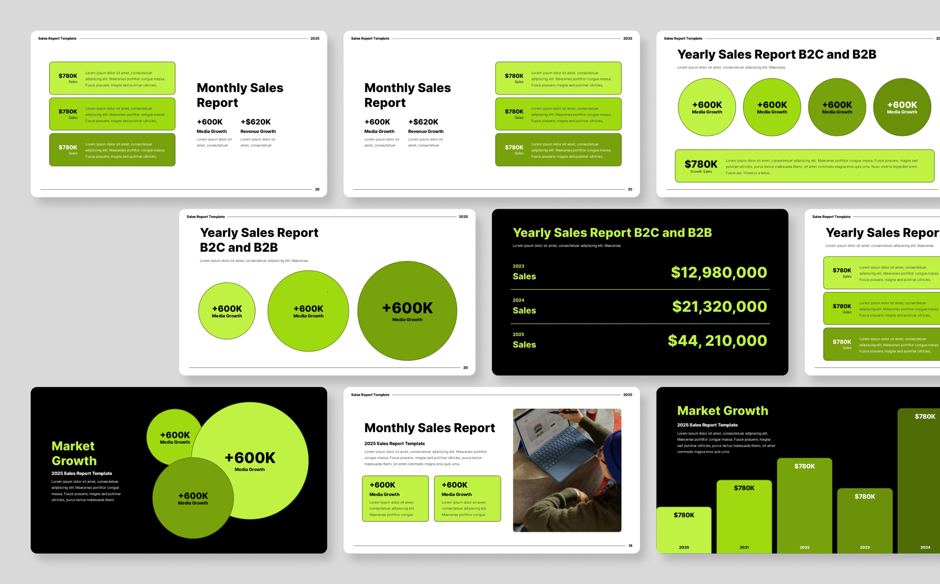 Deliver data-driven insights with confidence using this professionally designed sales report template. Structured for clarity, this PowerPoint template ensures seamless financial reporting, covering monthly sales tracking, annual performance evaluations, and market growth analysis.