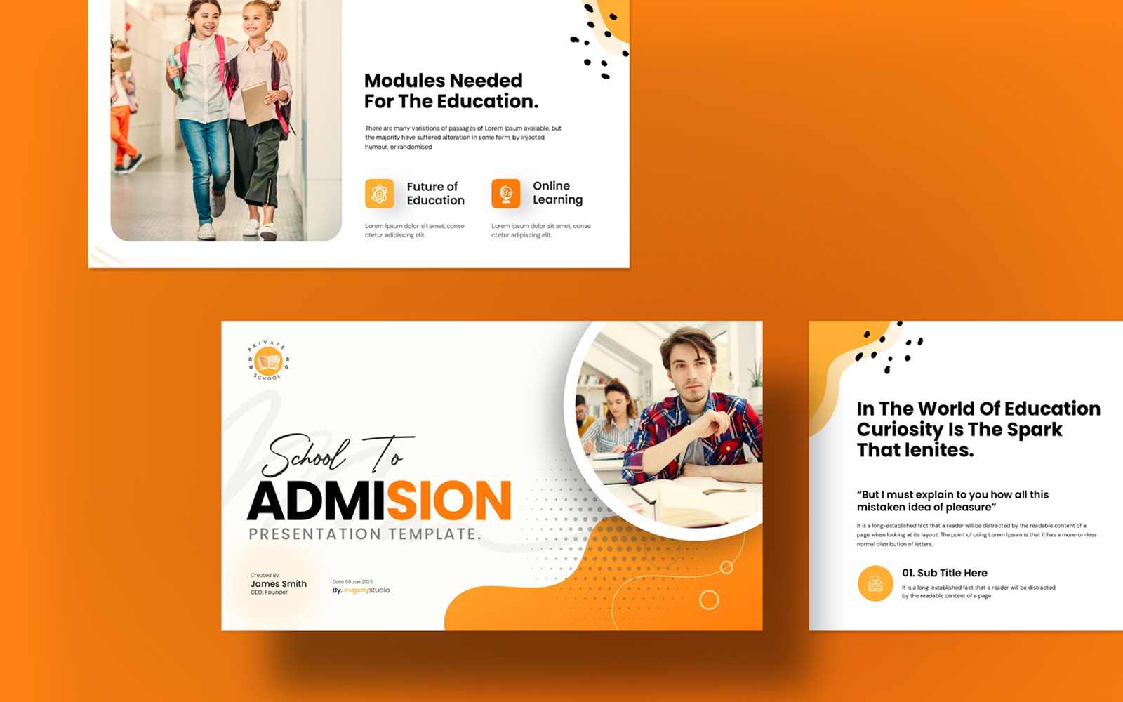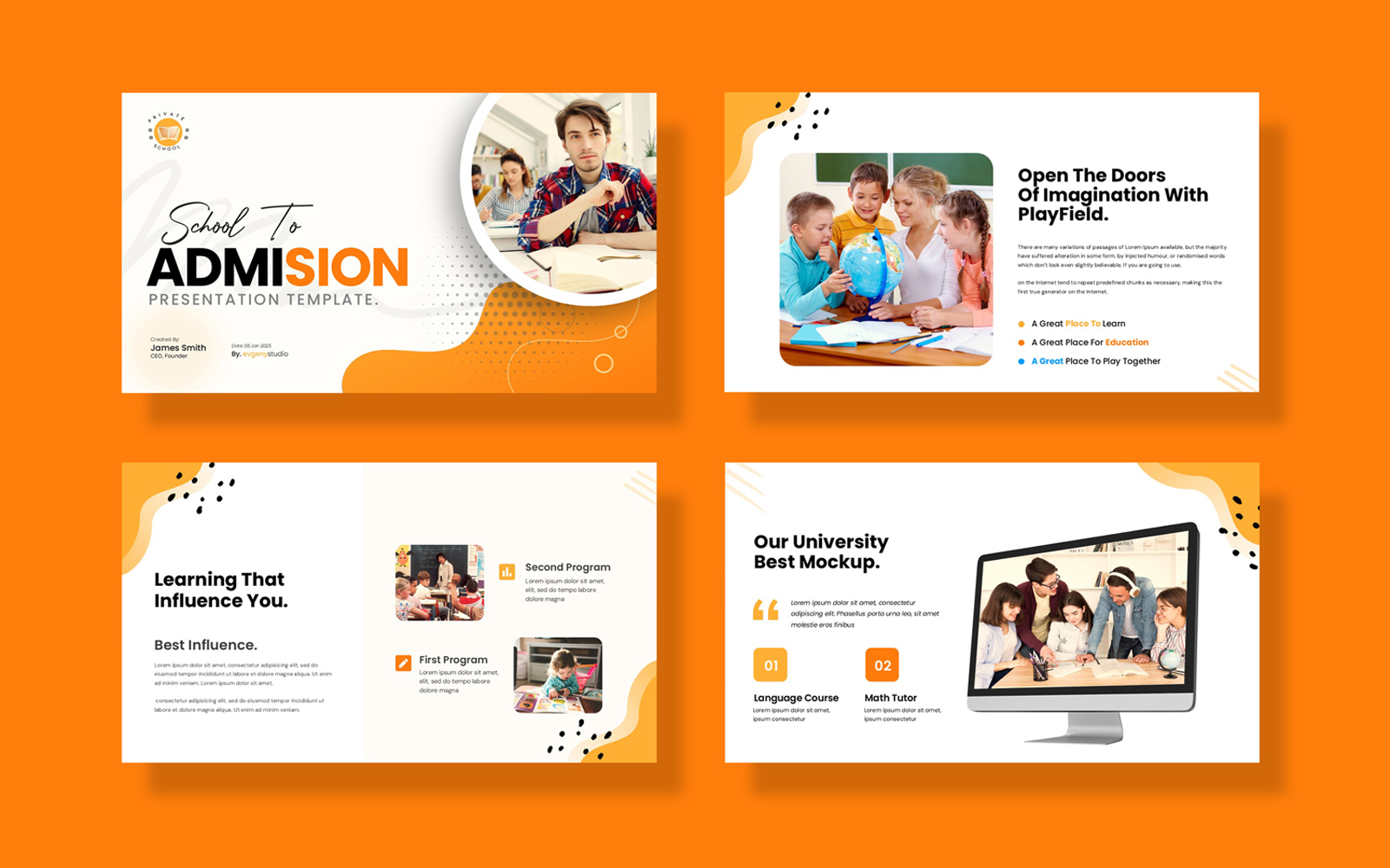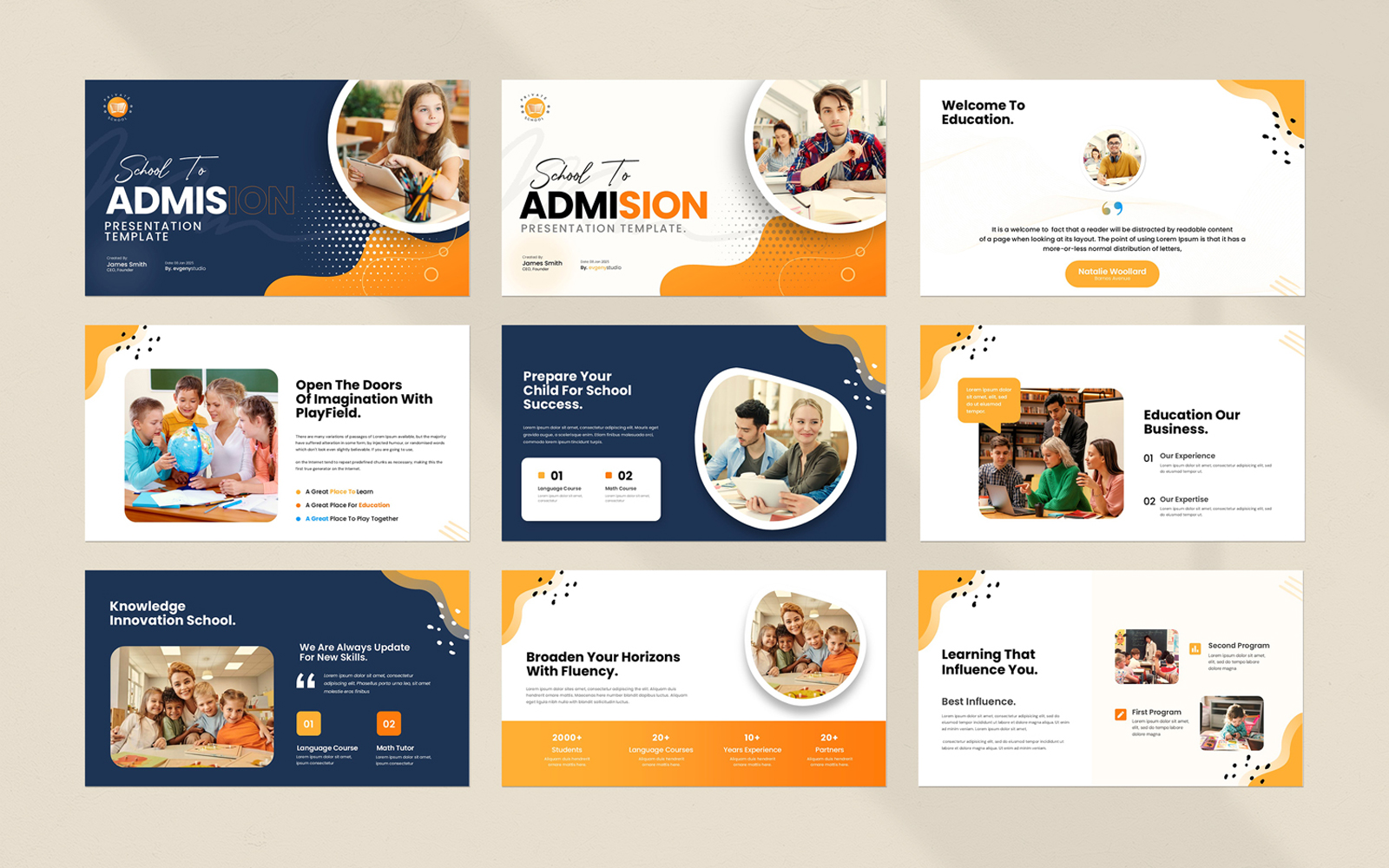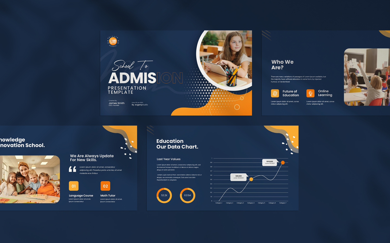Present your works in a professional and clean way with School of Admission Presentation Template. This is a simple contemporary but powerful design that includes creative photo layouts, infographics, tables, vector icons, diagrams and tons of great features to show your work and your company profile on another level.
