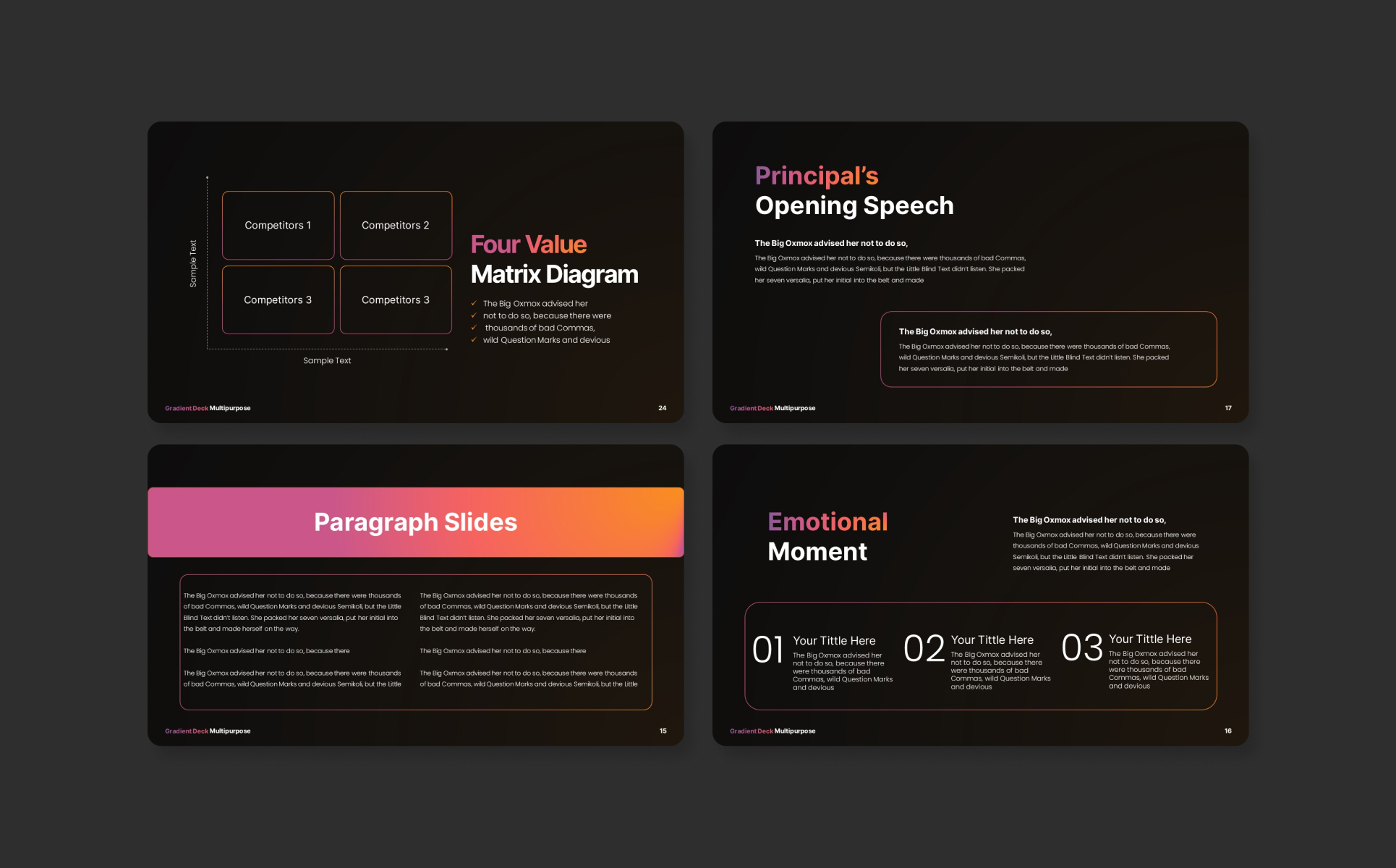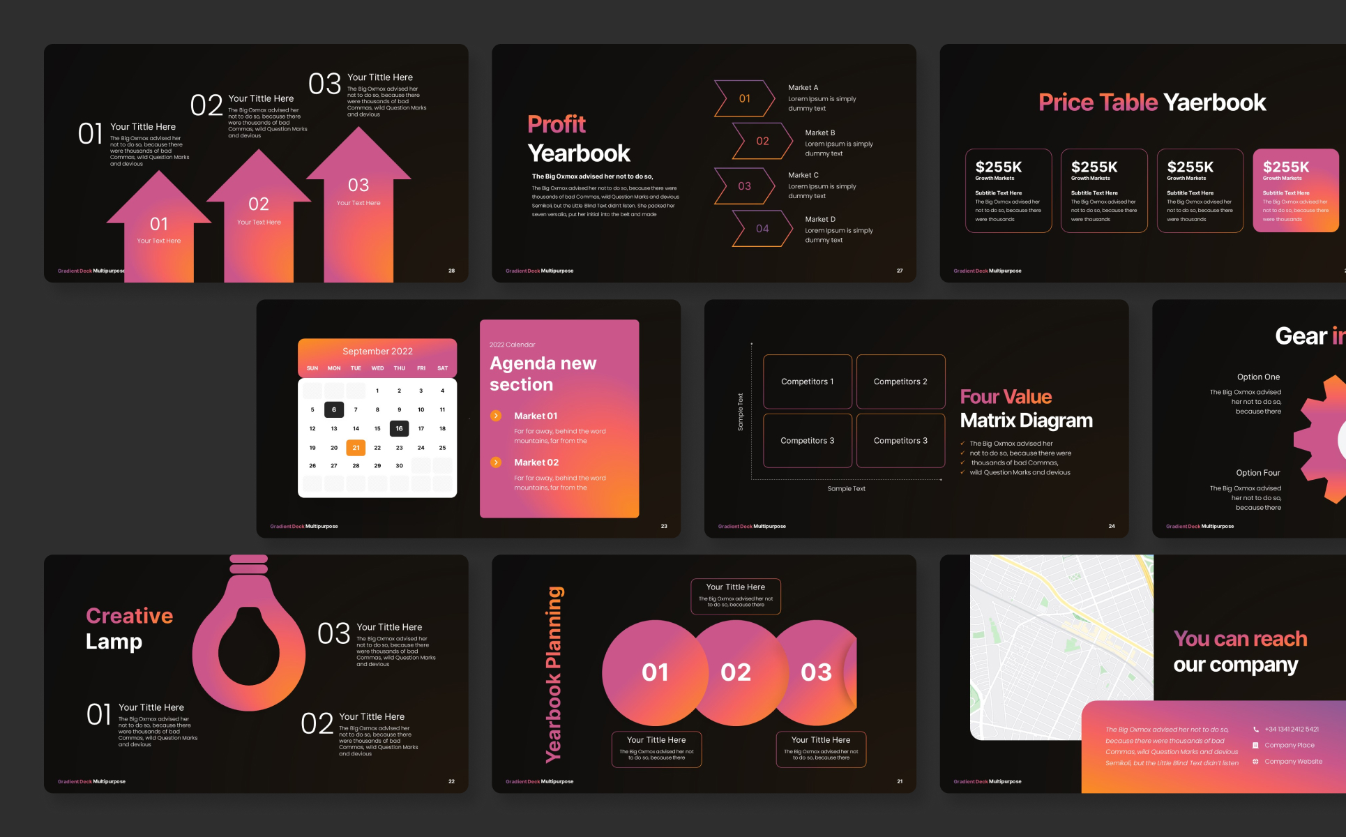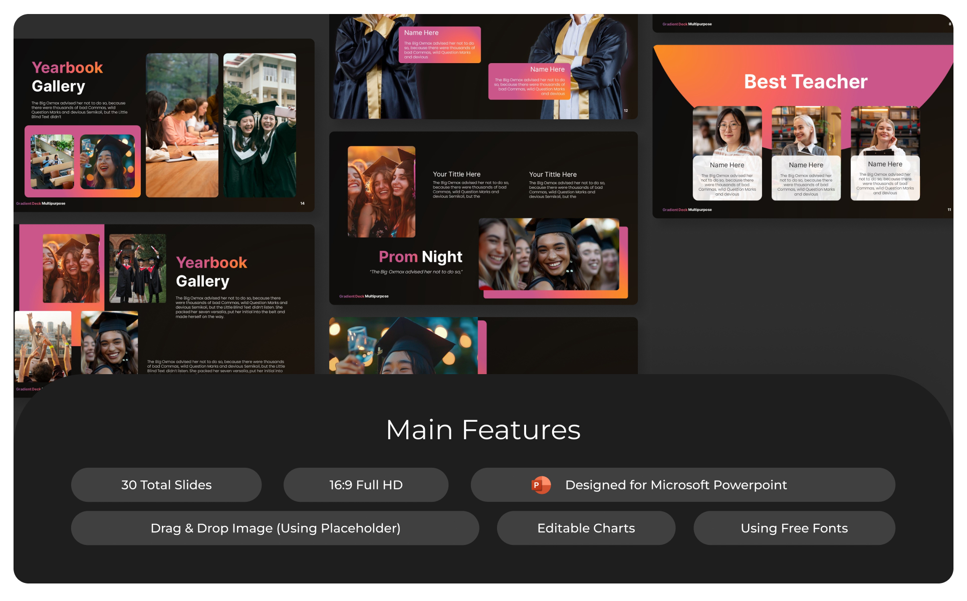 This presentation can also be used for multiple purposes, including student projects, teacher portfolios, school profiles, and more. With 30 unique and customizable slides, you can easily change the colors, modify the shapes, and insert images in just one click. All slides are fully editable to suit your creative needs.