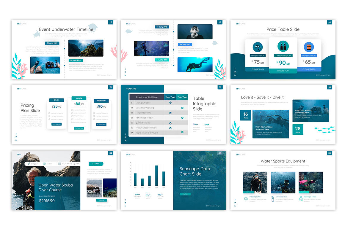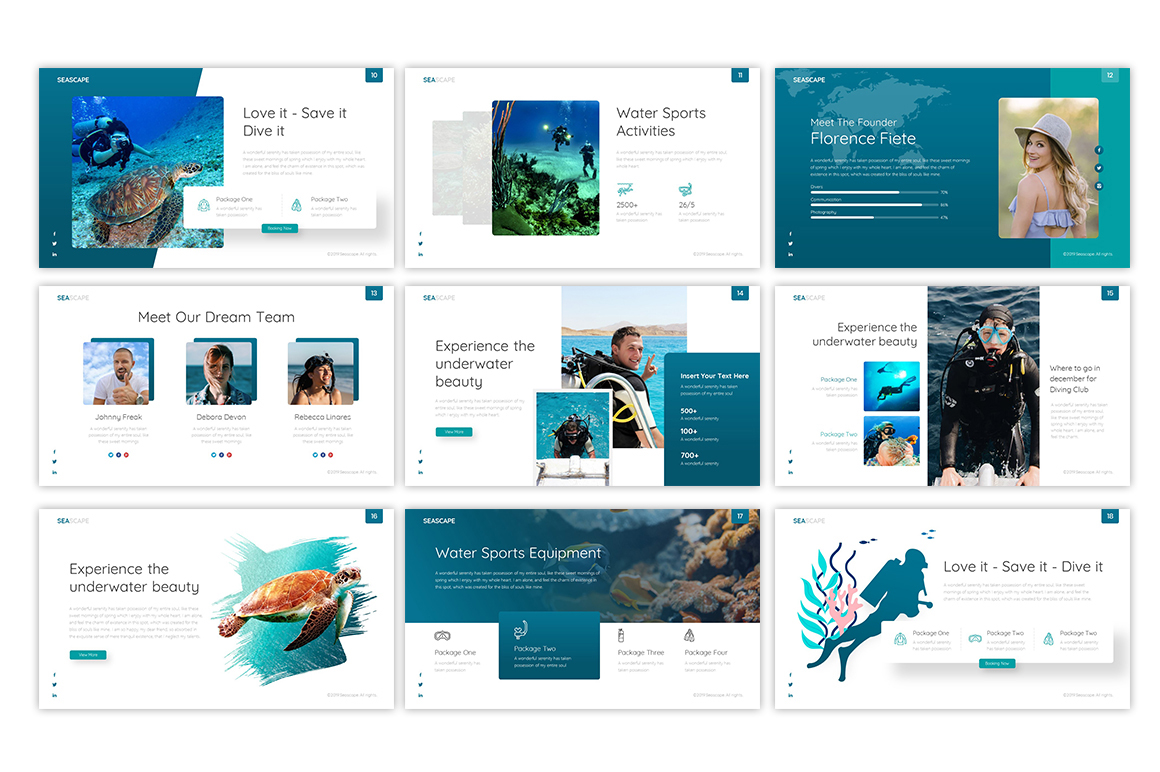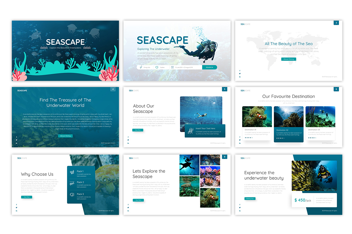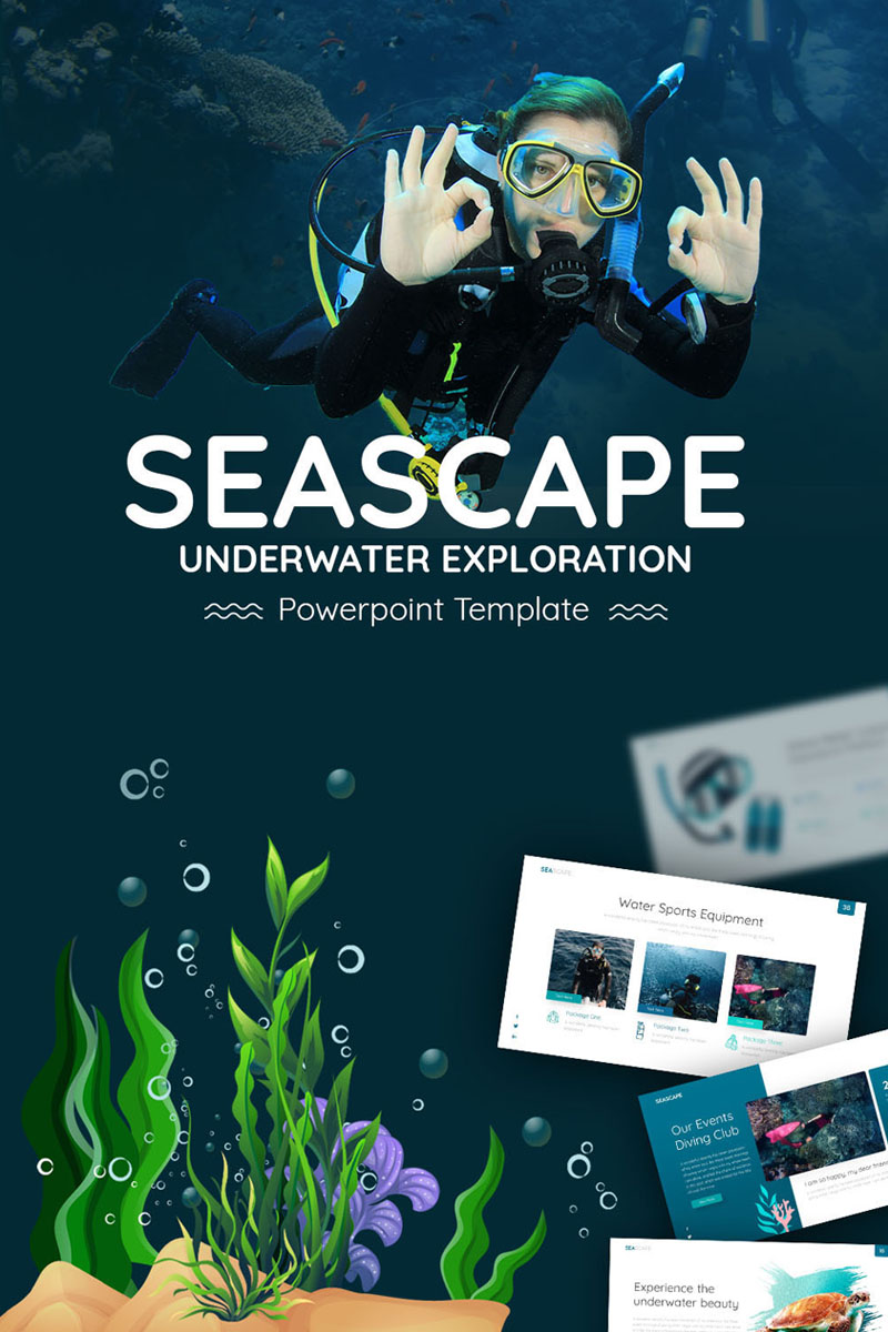 Seascape Multipurpose Travel & Nature PowerPoint Template is the perfect travel presentation template for travel agency pitching deck with the theme of underwater beauty.