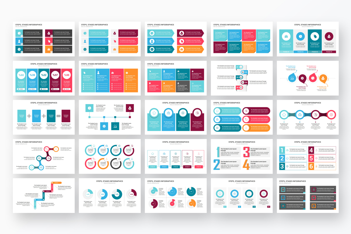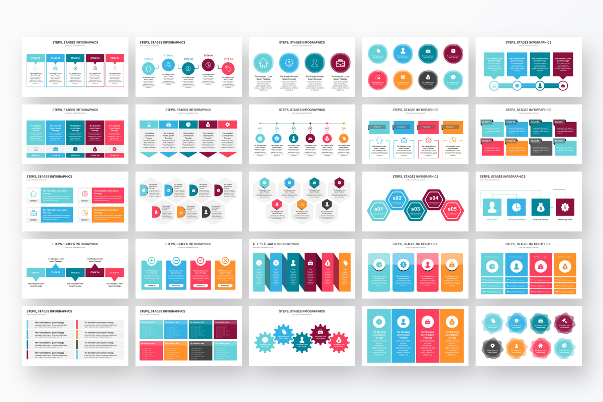 Big Collection of Stages infographics diagrams slides to convert your data visually into an amazing presentation. With 90 fully editable slides, infographics, and diagrams. Over 6500 professional icons are included. You can flawlessly move, resize or change colors throughout your presentation slides. Plue 102 color themes are included in this pack, which you can with One Click change the colors of all shapes, Icons, fonts, and auto recolored. or you can make your colors theme and apply it on all slides at once.