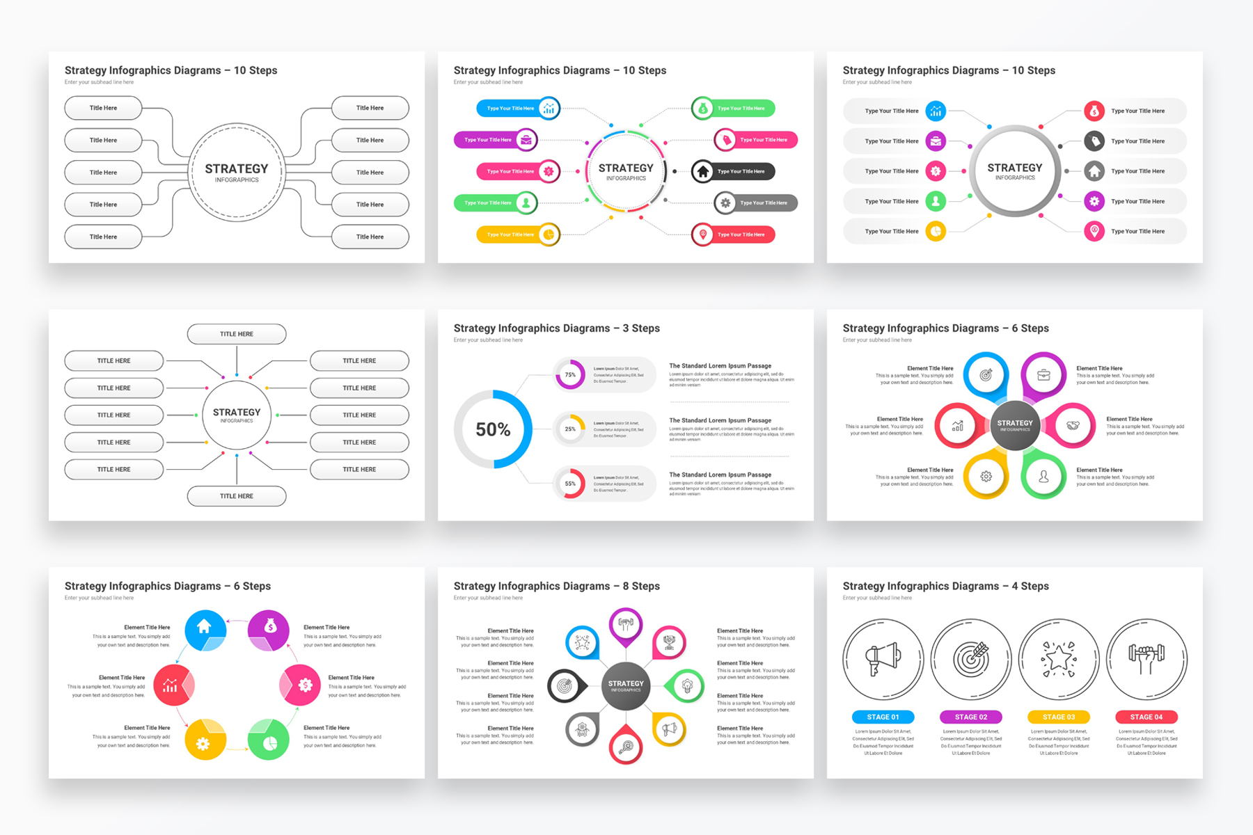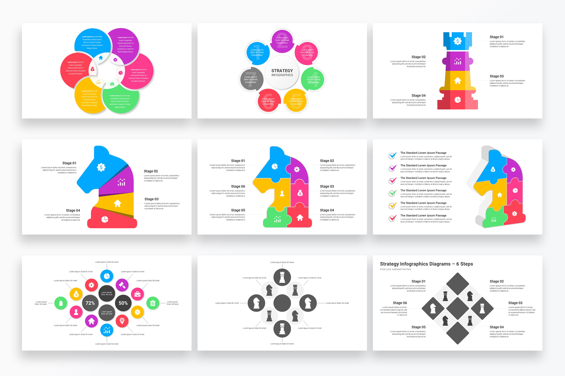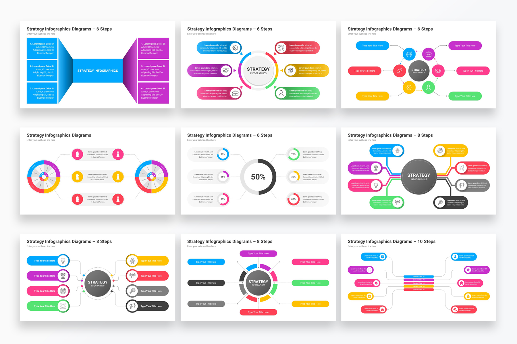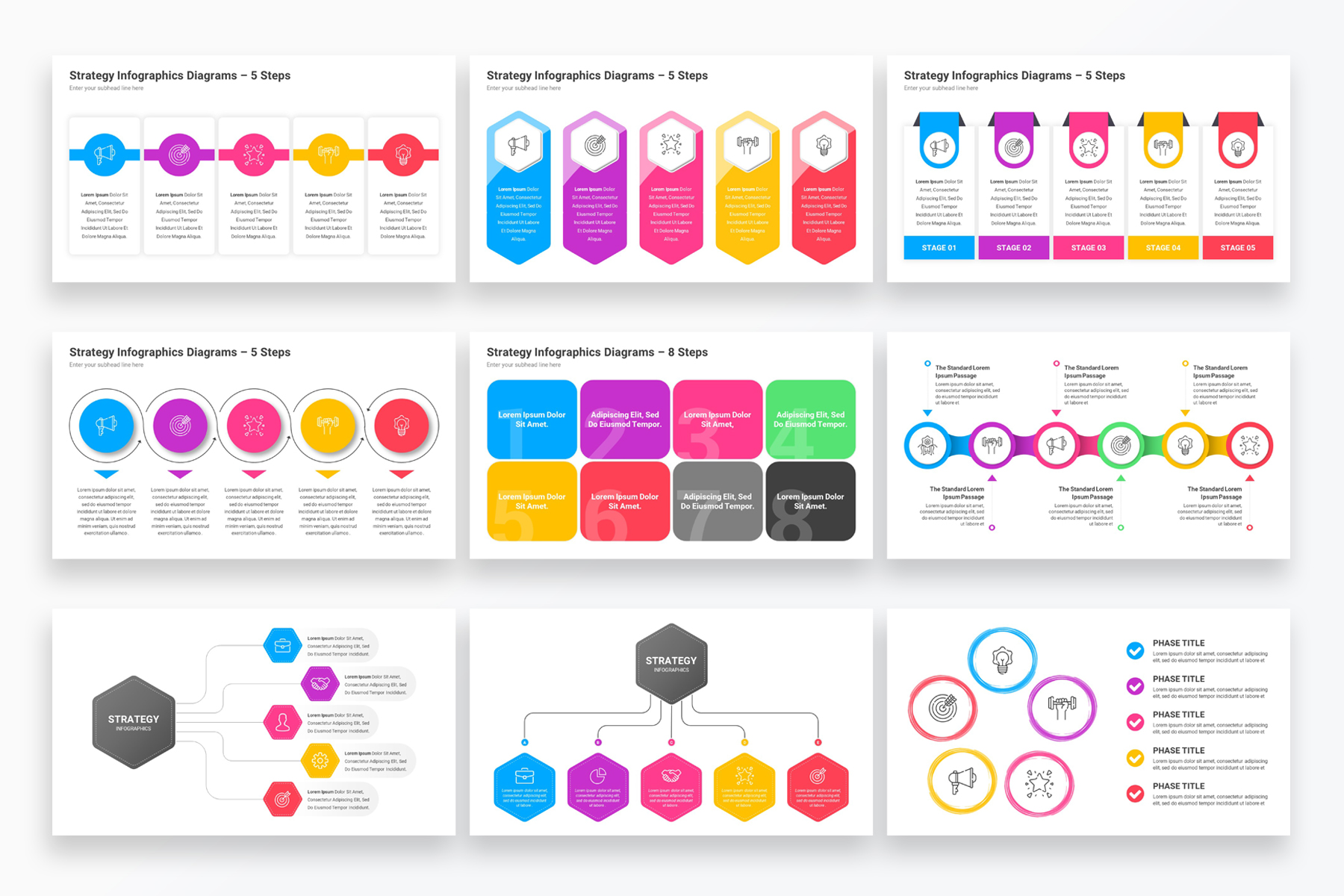 Big Collection of Strategy infographics diagrams slides to convert your data visually into an amazing presentation. With 52 fully editable slides, infographics, and diagrams. Over 5500 professional icons included. You can flawlessly move, resize, or change colors throughout your presentation slides. Plue 91 color themes are included in this pack, which you just can with One Click change the colors of all shapes, Icons, fonts, and auto recolored. or you can make your own color theme and apply it on all slides at once.
