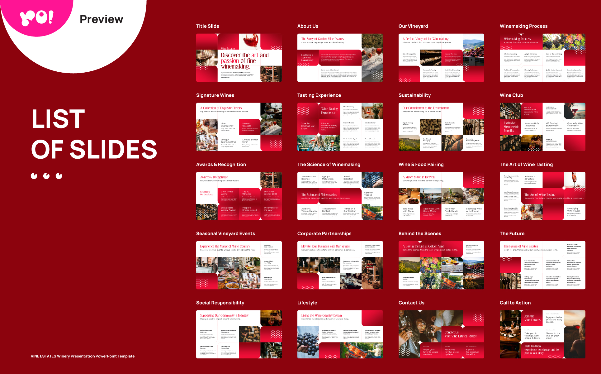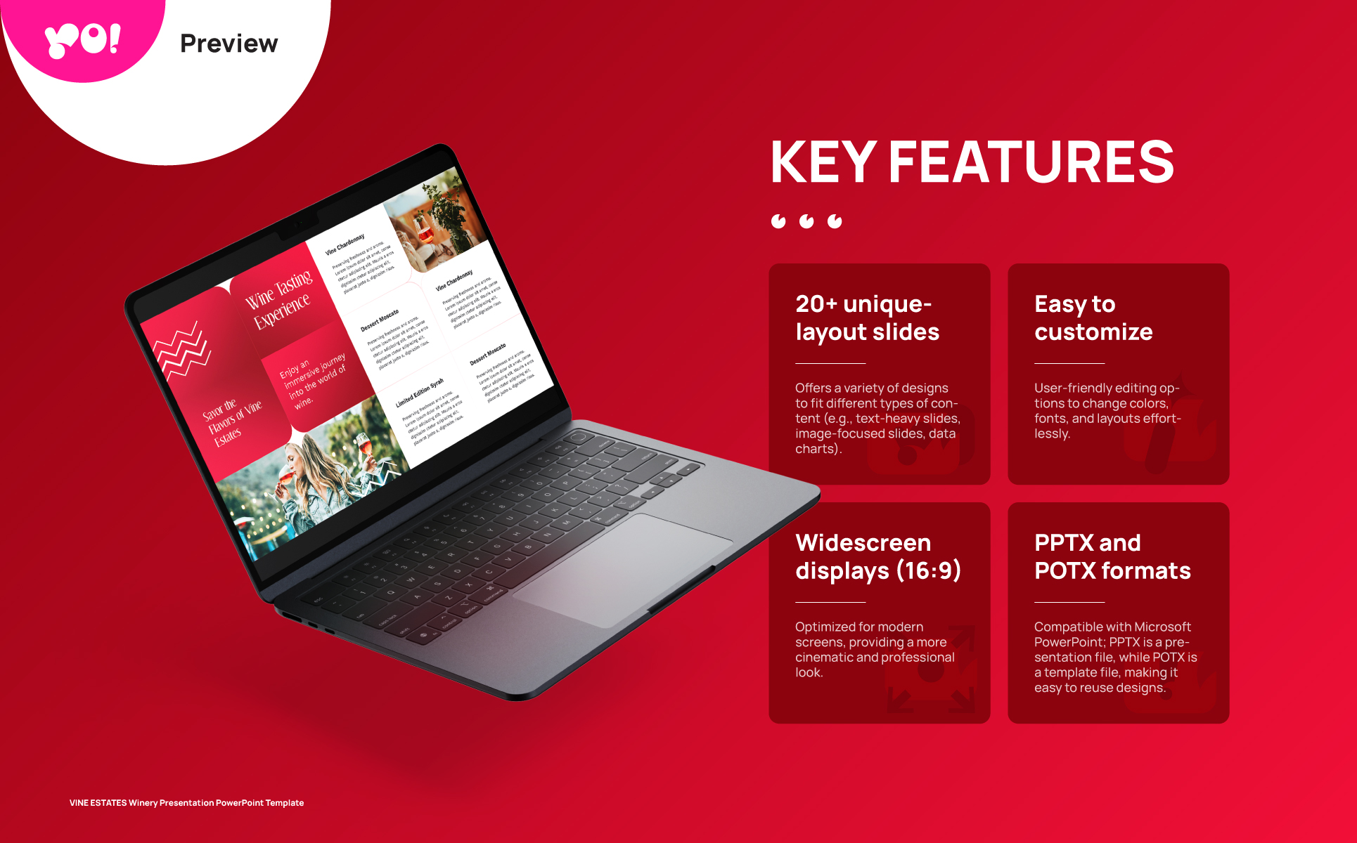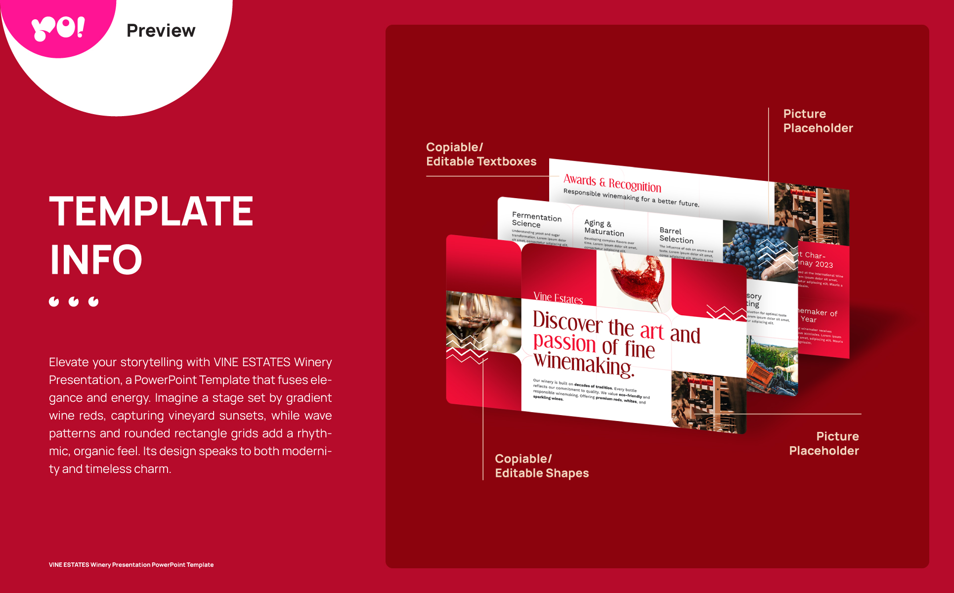 Elevate your storytelling with VINE ESTATES Winery Presentation, a PowerPoint Template that fuses elegance and energy. Imagine a stage set by gradient wine reds, capturing vineyard sunsets, while wave patterns and rounded rectangle grids add a rhythmic, organic feel. Its design speaks to both modernity and timeless charm. With 20 meticulously crafted slides in widescreen 16:9, it offers seamless adaptability—change colors, swap pictures, and tailor text with ease. Sip the essence of creativity—download now and uncork your vision!