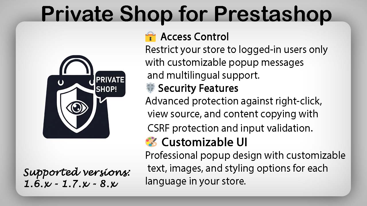 pTransform your PrestaShop store into a private, members-only portal with the strongPrivate Shop module/strong. It's the perfect solution for B2B, wholesale, or exclusive club stores, restricting access to logged-in customers only. Unregistered visitors are greeted with a professional, fully responsive, and customizable popup, which supports multiple languages./ppThis module offers robust security features to protect your content, including protection against right-clicking, content copying, and viewing page source. You retain full control, with the ability to keep specific CMS pages public while securing the rest of your shop. Optimized for performance with a built-in caching system and a user-friendly configuration panel, setting up your private store is fast and intuitive. Create an exclusive and secure shopping environment for your members./p