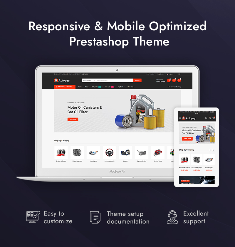 Autopzy is a powerful and professional PrestaShop responsive theme specially built for auto parts dealers, vehicle accessory shops, garage equipment stores, and automotive marketplaces. With its bold layout, clean structure, and high-performance design, Autopzy makes it easy to showcase a wide range of automobile parts and tools in an organized and visually appealing manner.