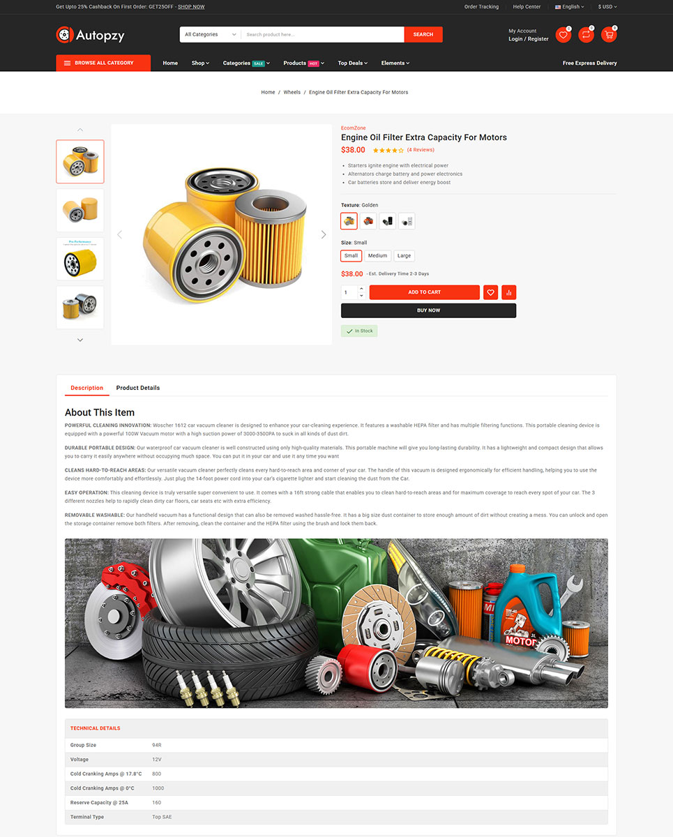 Autopzy comes with a Quickstart Installation Package, making it effortless to replicate the demo and launch your store instantly. Its advanced Mega Menu Builder helps you categorize products like spare parts, wheels, accessories, and repair tools for easy navigation. With AJAX-powered features such as smart search, product filters, quick view, and smooth cart updates, Autopzy delivers a fast, dynamic, and user-friendly shopping experience.