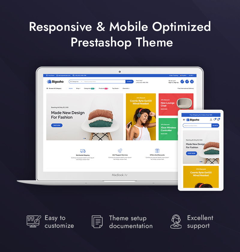 Bigsoho is a modern and versatile PrestaShop Responsive Theme designed for large online stores and multi-category marketplaces. It is suitable for a wide range of industries including fashion, electronics, furniture, beauty products, groceries, accessories, home décor, and more. The theme is structured to handle stores with extensive product catalogs, offering clear category organization, strong visual hierarchy, and smooth navigation to help customers find what they need quickly and comfortably.