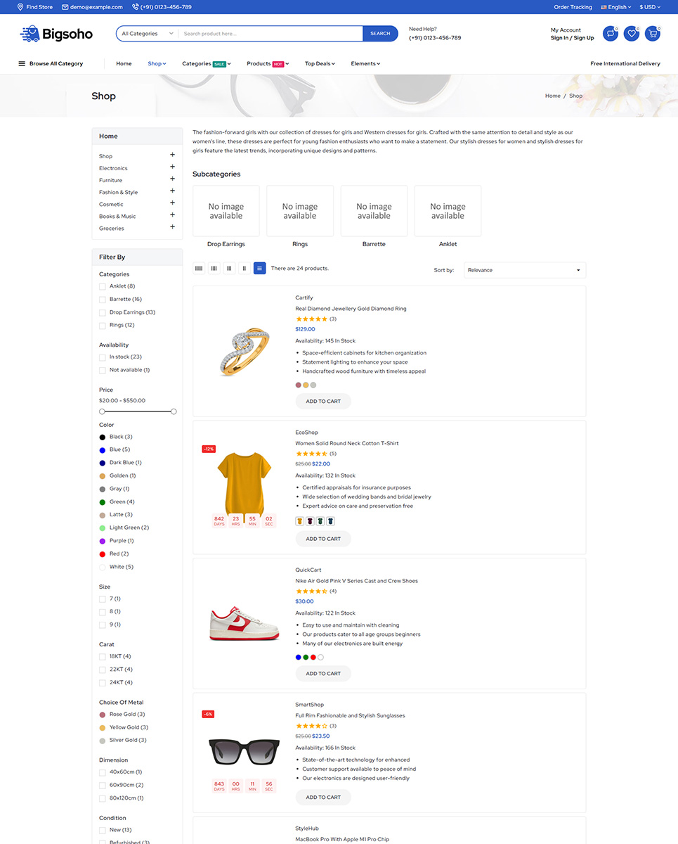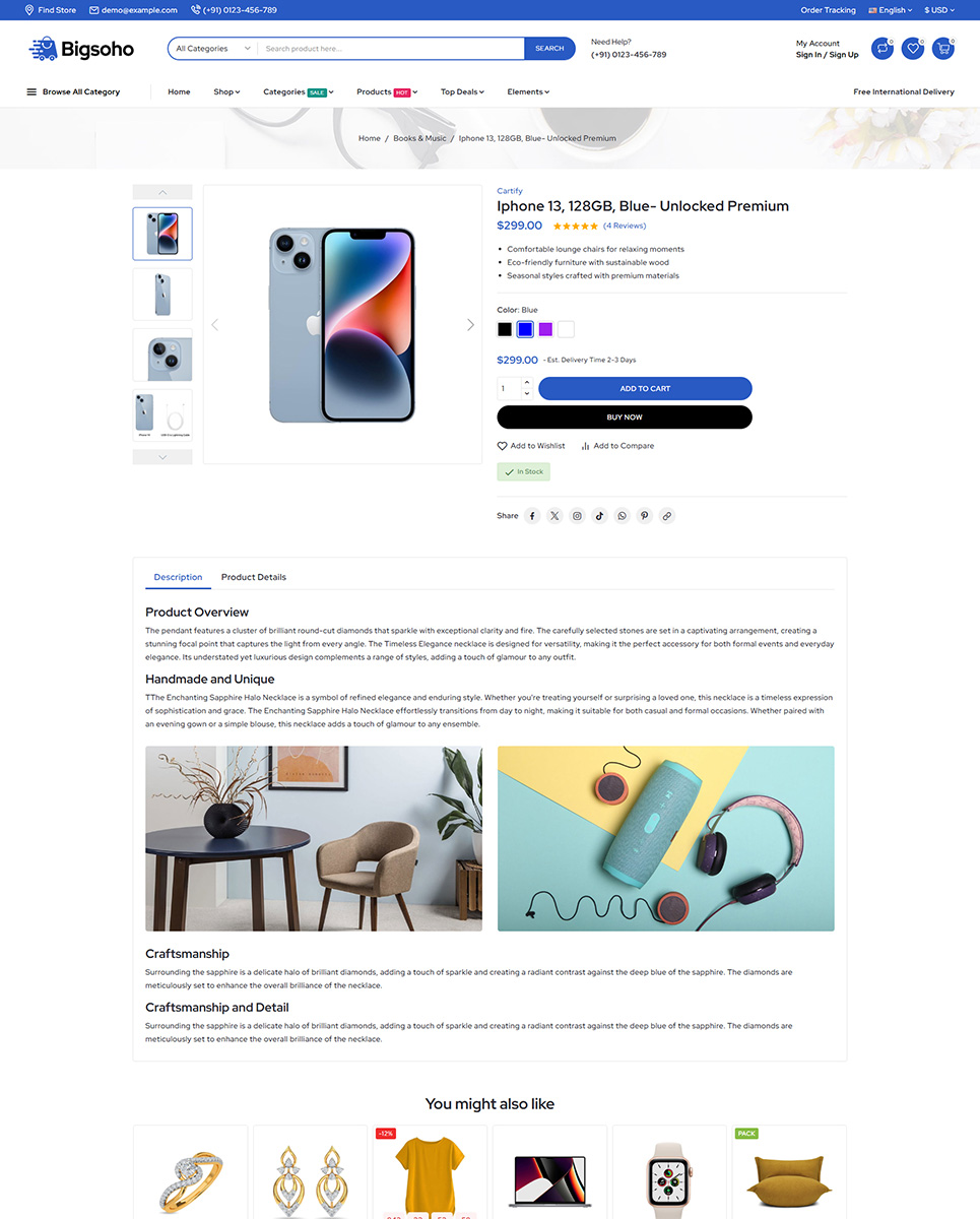 Bigsoho is fully responsive, ensuring that the store adapts seamlessly to different screen sizes including mobile devices and tablets. Product pages are designed with focus on clarity, allowing customers to view product details, variations, pricing, and reviews in a simplified and visually appealing format. Additional built-in features like quick view, wishlist, and compare options enhance user interaction and encourage more confident purchasing decisions.