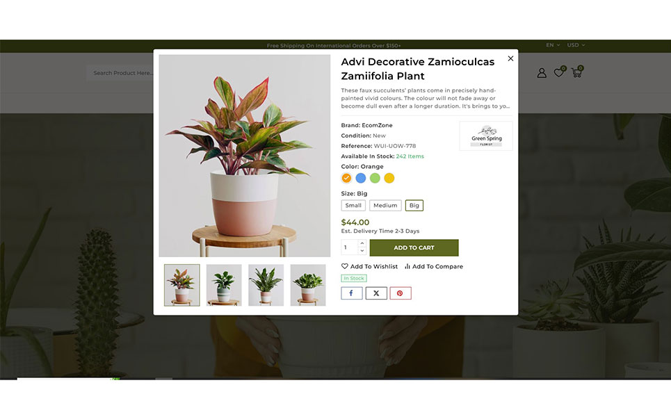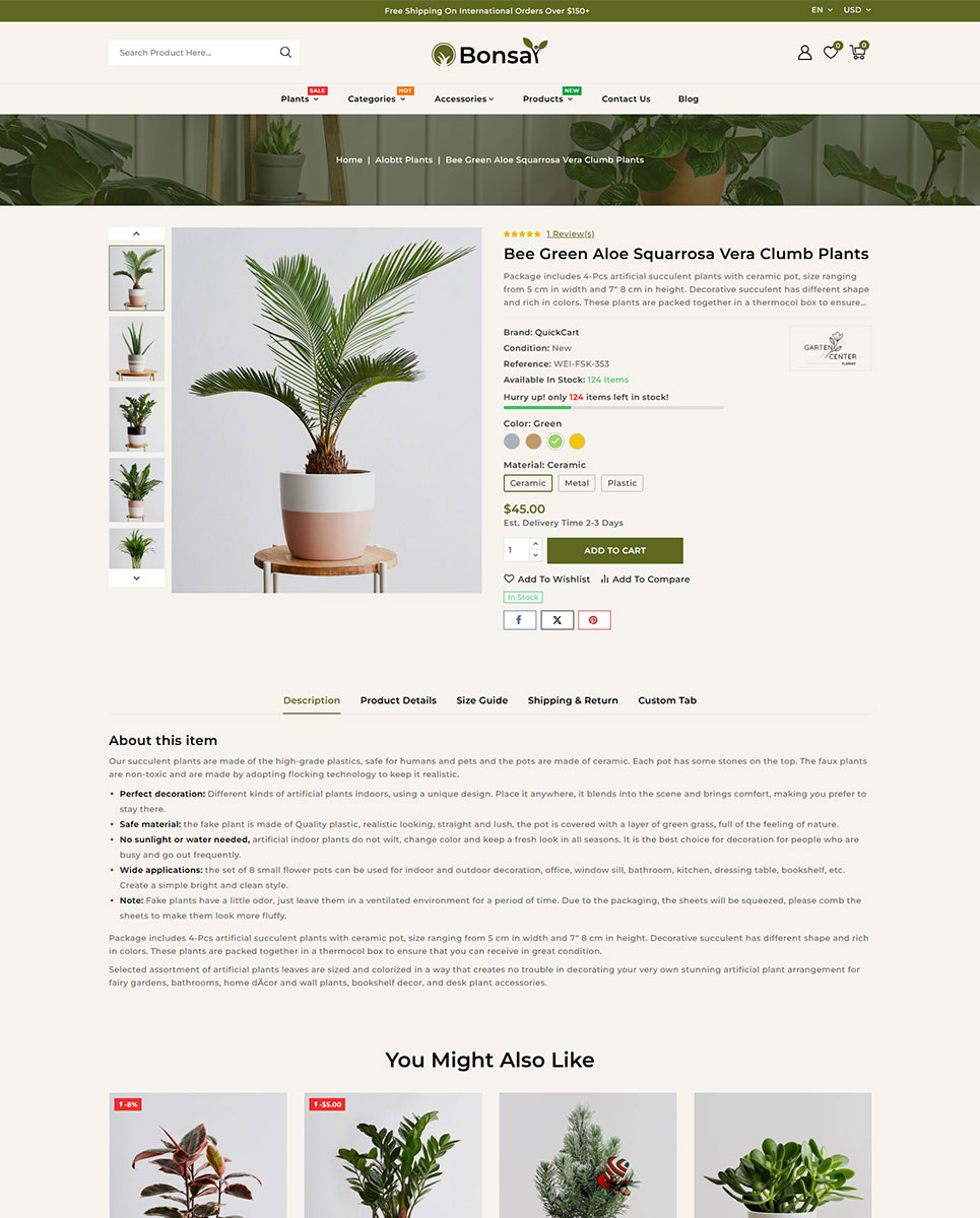 This theme is equipped with Ajax-powered features, including Ajax search, Ajax cart, wishlist, and product comparison, allowing customers to browse and shop effortlessly. The advanced product filter helps them quickly find plants and accessories based on categories, sizes, or care requirements.