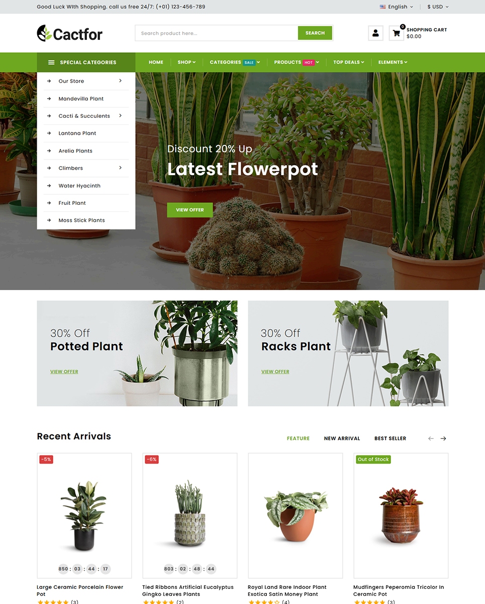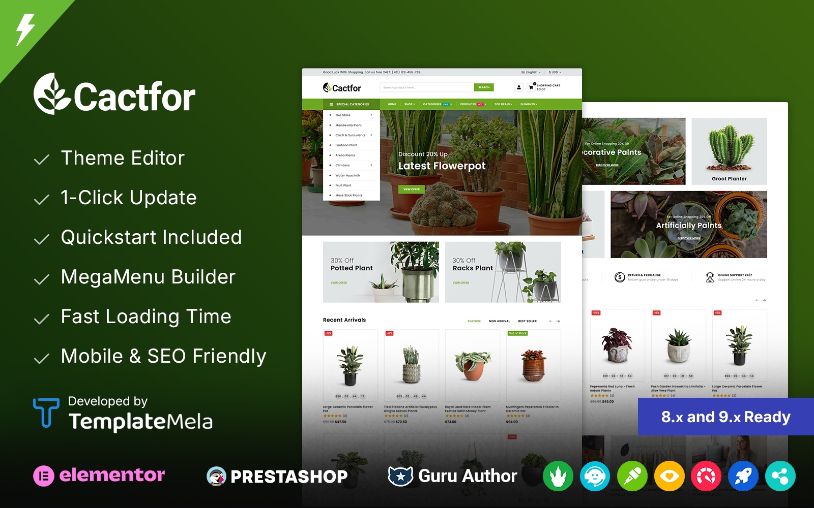 Cactfor - Plants & Gardening Tools is professional minimalist responsive prestashop theme built to create modern powerful e-Commerce website. Cactfor Prestashop Theme is seo optimized to be friendly with most popular search engines. Cactfor Prestashop Theme configuration gives the control with flexible settings, fast loading, fast support and much more. Cactfor Theme Including one-click (Quick Start) package to get a replication of demo theme store installed on your website with same as demo content, graphics, theme settings & layouts etc. Cactfor Prestashop Theme supporting the latest version of Prestashop.