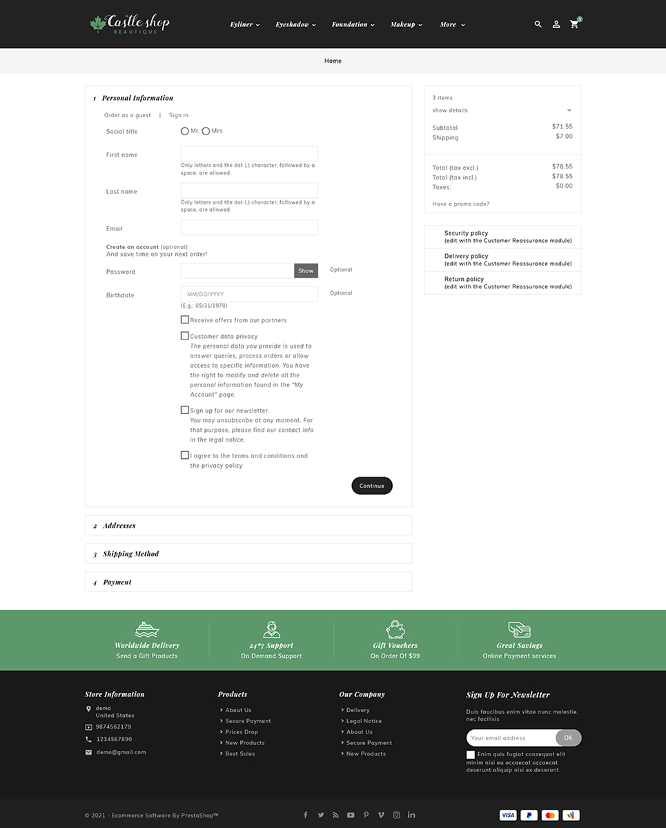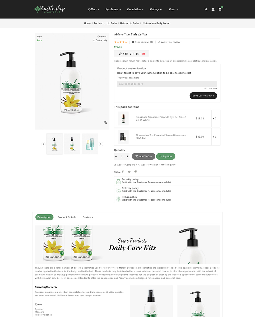 Castle shop has a simple, modern, and clean design with a 100% responsive layout, and very easy to customize all CMS module content from Prestashop back-office and without having to understand coding standards. Castle shop is best suitable for online Beauty, Spa, Salons, Yoga, Barbershop, Care, Hair, Health, Massage, Medical, Physiotherapy, Wellness Center, Makeup, Cosmetic. It can be used to promote your Online cosmetic products. the demo can be imported easily with only one click. You can customize it very easily to fit your needs.