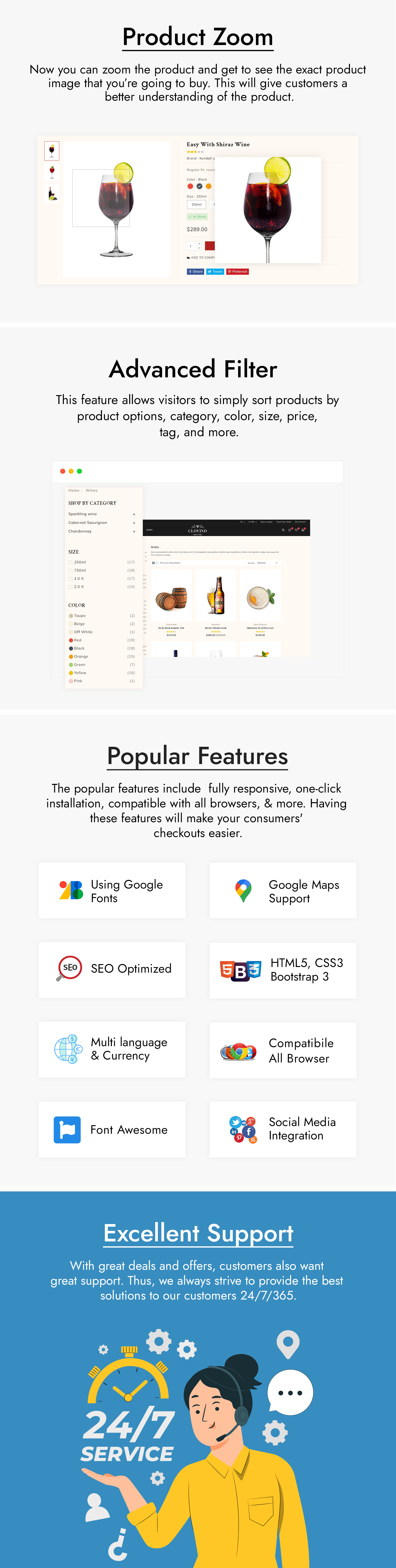 Enhance your wine and liquor selections with eye-catching graphics. Showcase your carefully chosen collection with eye-catching photos and galleries, ranging from rich reds to clean whites, so that consumers can taste the character of each bottle before deciding which one to buy.
