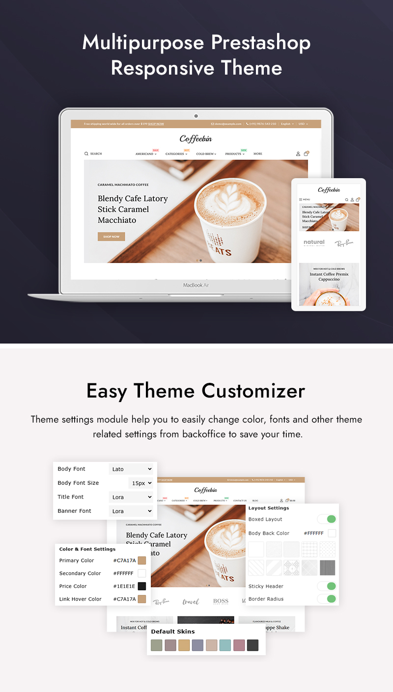 Coffeebin - Coffee Store PrestaShop Responsive Theme is a modern and stylish eCommerce theme designed specifically for coffee shops, cafés, and organic beverage stores. Built on the latest PrestaShop 8 framework, it ensures excellent performance, responsive design, and full compatibility with the newest features. The theme comes with a clean and warm layout that creates a cozy and inviting atmosphere, ideal for showcasing coffee products and accessories.
