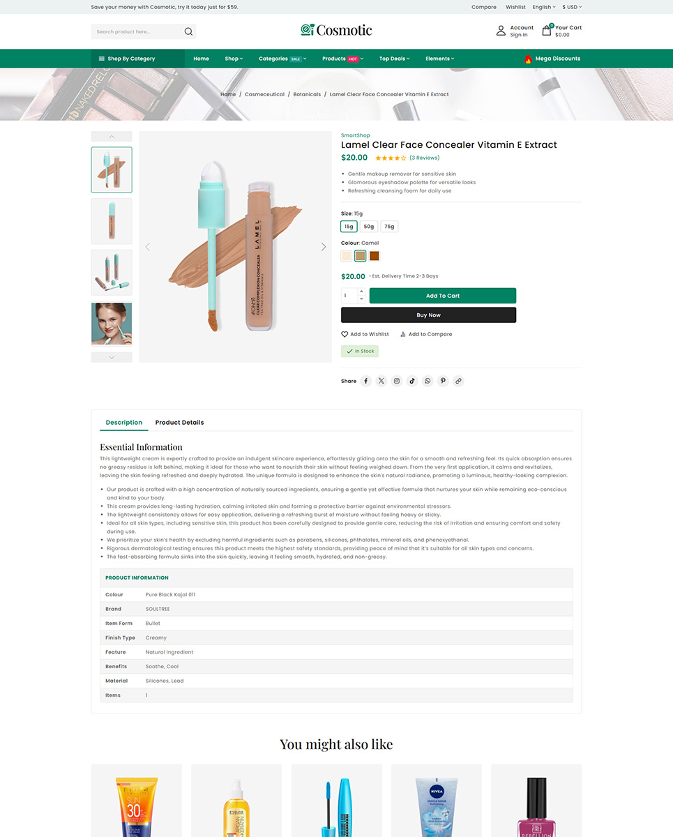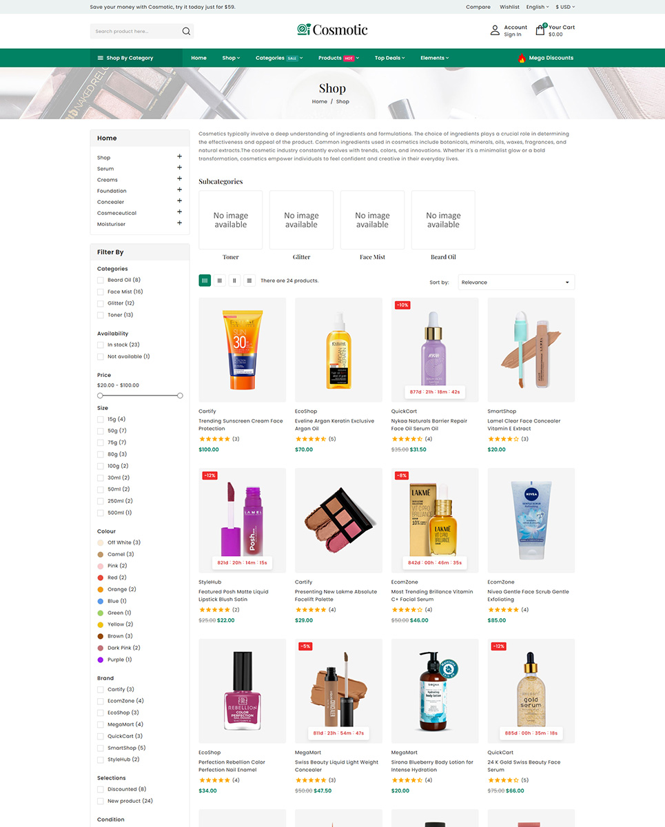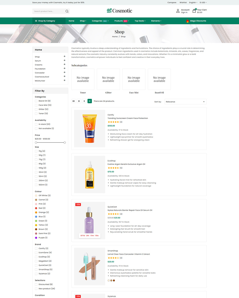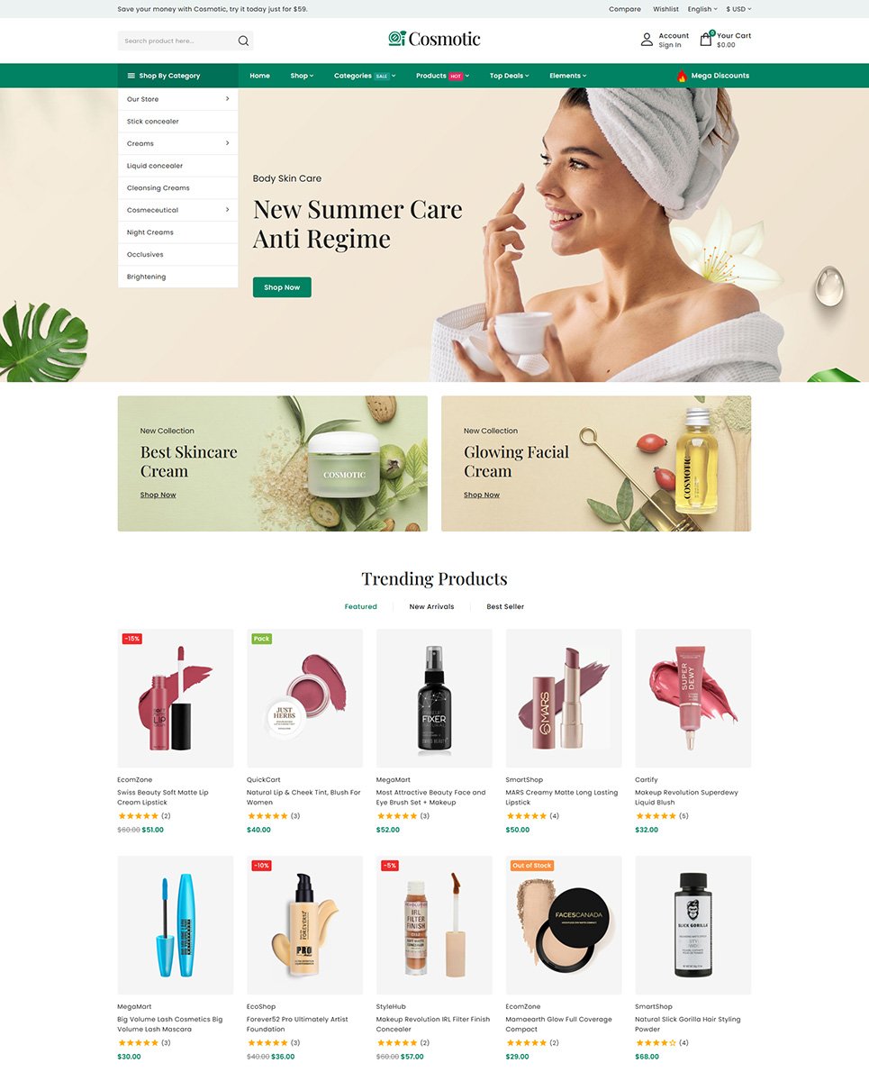 Cosmotic comes with a Quickstart Installation Package, enabling you to replicate the demo and launch your store quickly and effortlessly. The advanced Mega Menu Builder allows you to display product categories, brands, and offers in a clean and well-organized structure. Enhanced with AJAX-powered features like smart search, quick view, product filters, and seamless cart updates, Cosmotic provides a smooth and engaging shopping experience for your customers.