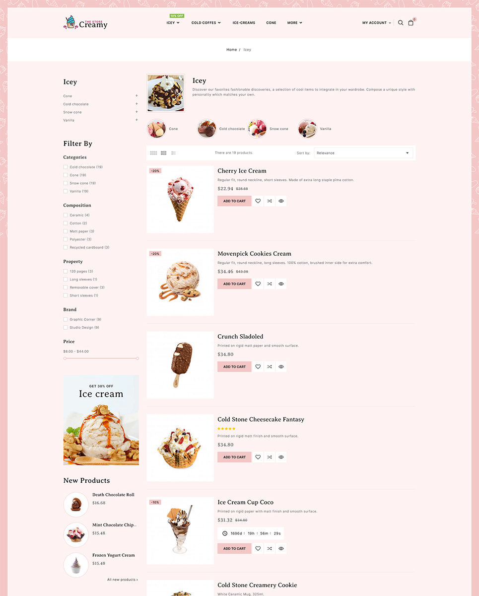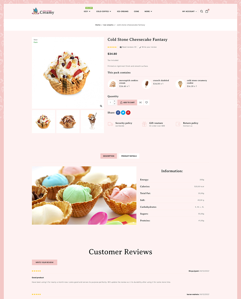Creamy - Ice Cream, Drink, Cake Store Multipurpose Prestashop Store is our most robust theme yet! In addition, we've added our touch of tasteful animations, & color-combinations that are applied throughout. Perfect website for ice cream, cake, coffee, Bread, cones, candy, chocolate, sweets, drink, cupcake, bakery, organic, food, and multipurpose store! The Creamy store comes with 2 different homepage layouts. Creamy is a well-organized theme with an extensive category list and a modern search option so that site visitors can easily access the products they need.