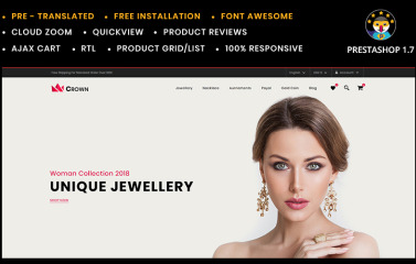 Crown Prestashop 1.7 theme which will easily fit to products like Jewelry, Cutlery, Fashion, Art, Watch, Accessories & multi-purpose stores. The theme is 100% responsive & supports all devices, user-friendly. This theme is fully pre-translated in 3+ languages. Theme package has quickstart package which allows to create online store within few clicks.
