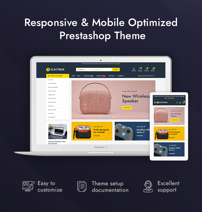 Electbox – Smart Electronics Gadgets Store PrestaShop Responsive Theme is a sleek and modern eCommerce theme tailored for electronics stores, tech gadgets shops, mobile and accessories retailers, smart home device markets, and digital product brands. Designed with clean layouts, minimal aesthetic, and product-focused presentation, Electbox helps you showcase your latest tech collections in a stylish and engaging manner.