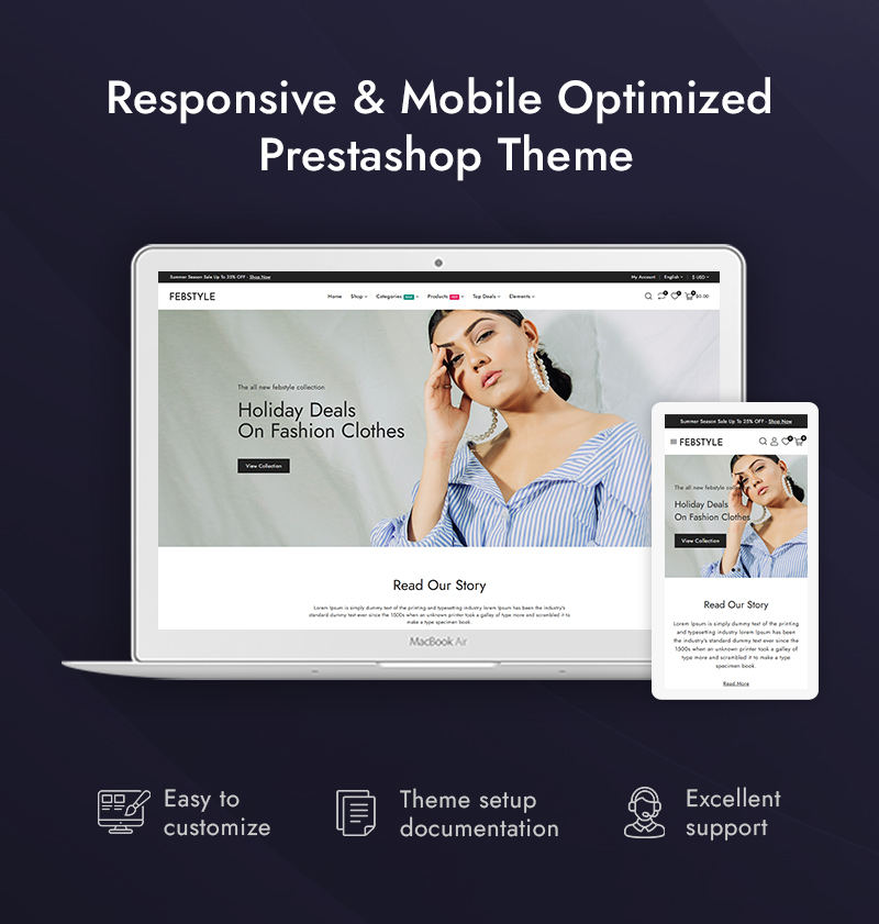Febstyle is a contemporary and stylish PrestaShop responsive theme designed specifically for online fashion boutiques, clothing retailers, footwear shops, accessories collections, and trend-focused lifestyle brands. With its clean layout, bold visual sections, and modern typography, Febstyle gives your store a strong, fashionable identity that helps your products stand out beautifully.