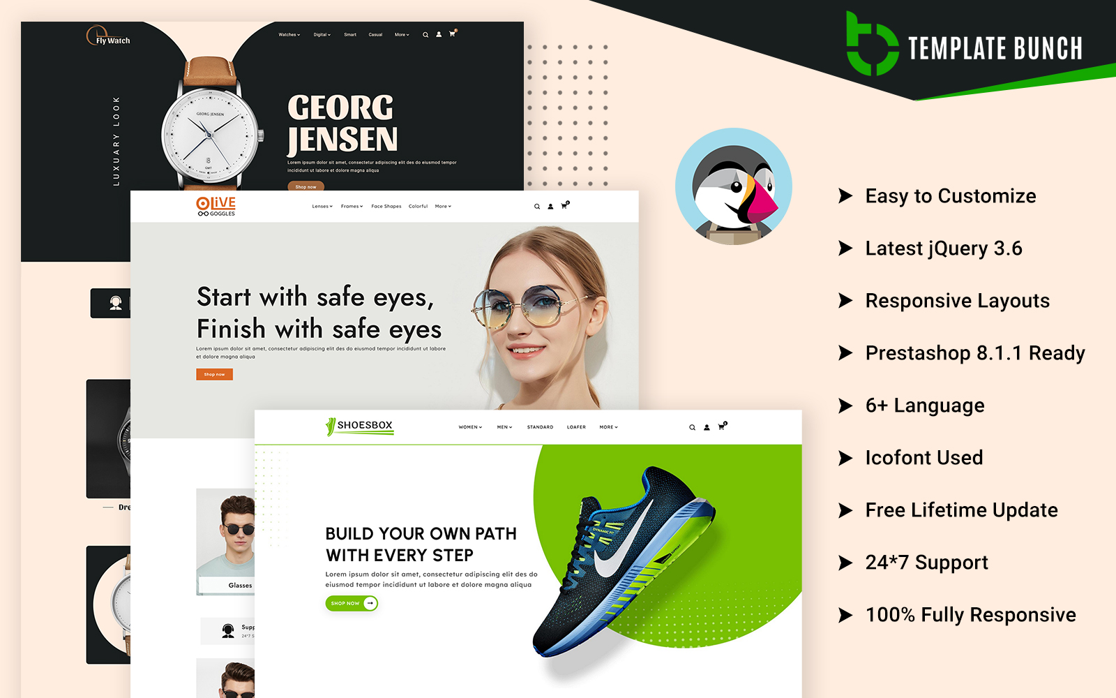 In this demo, we offer three distinct layouts that you can integrate into your store. Built on Prestashop 8.1.1, this demo is compatible with all versions of Prestashop. Not only does it support English, but we have also included the Arabic language. The demo is optimized for mobile devices, laptops, and tablets. Furthermore, all sections are easily customizable, allowing you to tailor them to your store's needs. Whether you run a watch, goggles, shoes store, or any other business, this demo provides a seamless solution for your customization needs.