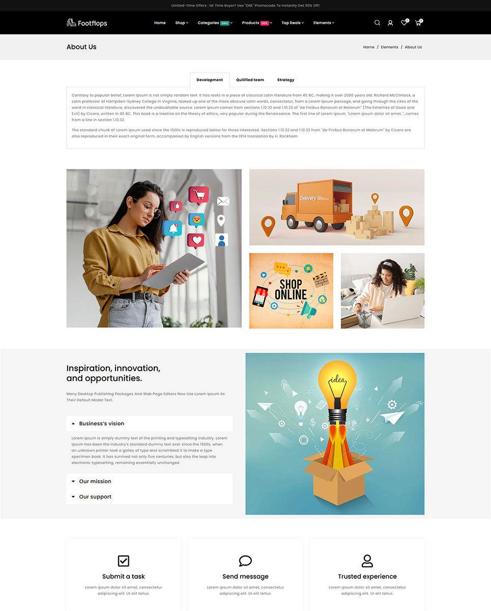 Fully responsive, the theme adapts perfectly to smartphones, tablets, laptops, and desktops, providing a consistent shopping experience across all devices. Additionally, Footflops is SEO-optimized, lightweight, and performance-focused, helping your store achieve faster loading times and improved search ranking.