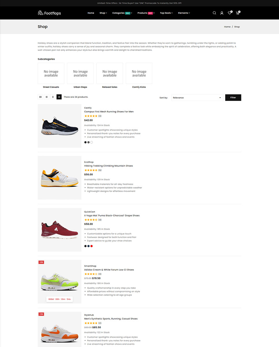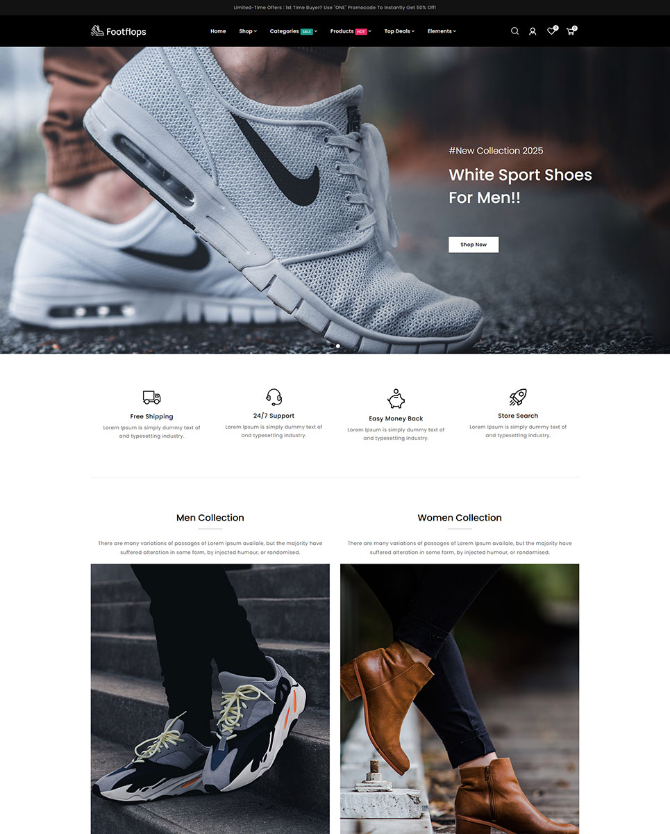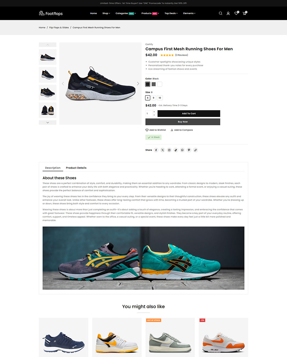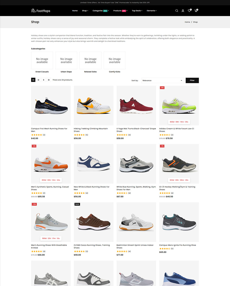 Whether you’re offering branded sneakers, streetwear footwear, sports trainers, or comfort casuals, Footflops provides the ideal foundation to build a visually appealing, modern, and conversion-focused online footwear store.