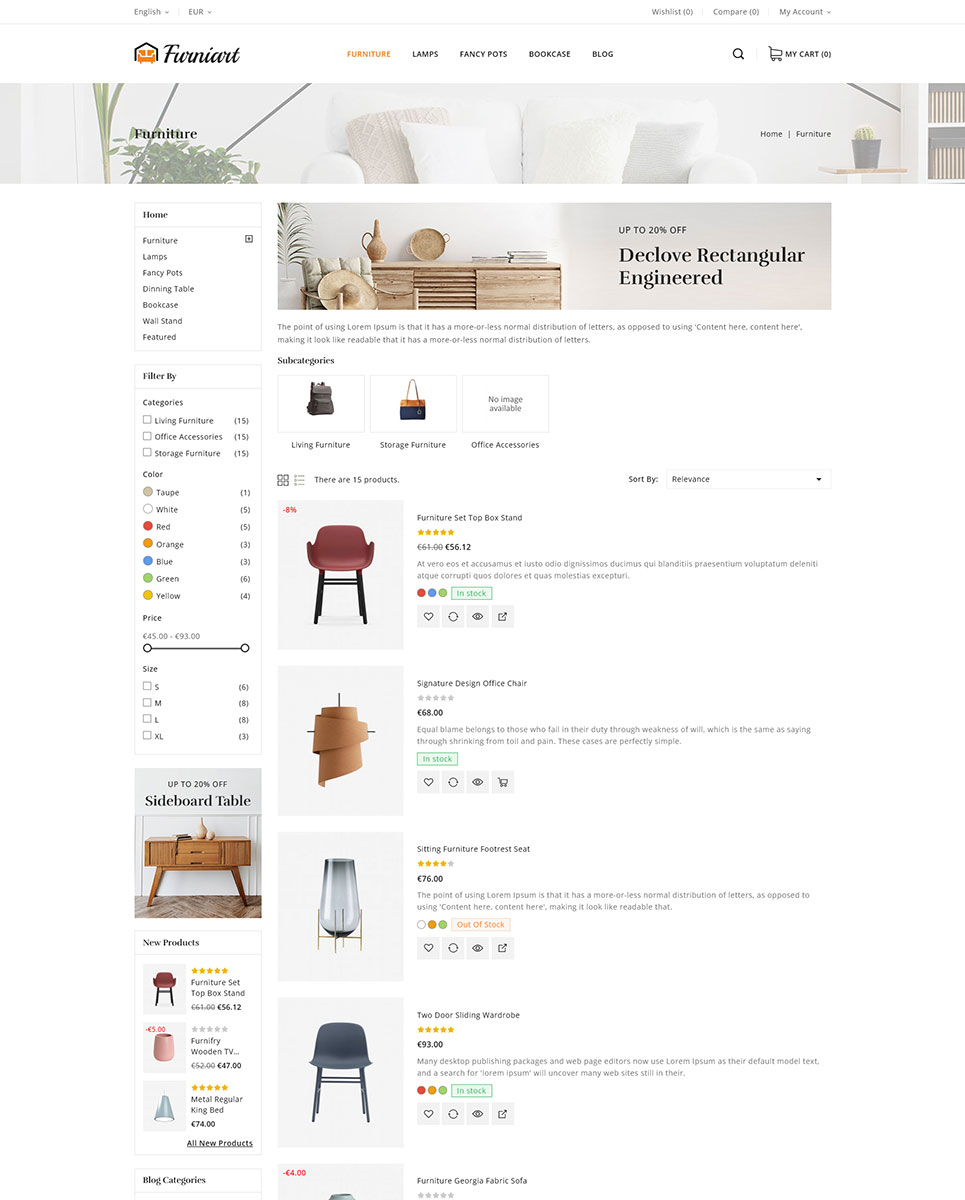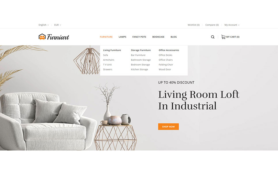 The premium responsive theme Furniart - Interior Furniture Shop is perfect for online stores selling furniture, home decor, interior, tables, lights, handicrafts, art work, accessories, and other related items. The robust Theme Options Module allows you to quickly modify the appearance and feel of the theme thanks to its unlimited color schemes family settings.