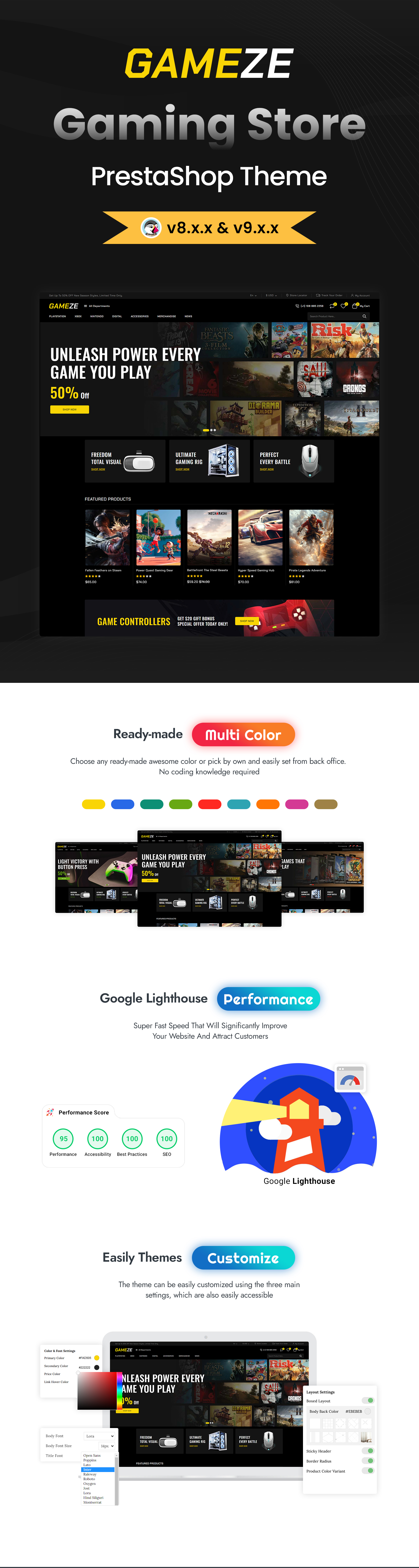 Gameze: A Store for Gaming and eSports The PrestaShop theme is a cutting-edge, responsive, and dynamic theme developed for eSports stores, gaming accessory merchants, and gamers. It enables you to stylishly display consoles, gaming accessories, merchandise, and digital products thanks to its striking design and adaptable layouts. For a fun shopping experience, Gameze Theme offers a big menu, rapid view, sophisticated product filtering, and seamless navigation. With its SEO optimization and quick loading speed, it ensures smooth operation while increasing visibility. The Gameze Theme is the ideal option for creating a polished and successful virtual game store.