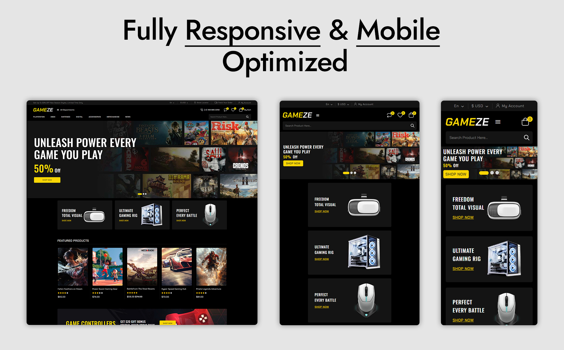 Gameze: A Store for Gaming and eSports The PrestaShop theme is a cutting-edge, responsive, and dynamic theme developed for eSports stores, gaming accessory merchants, and gamers. It enables you to stylishly display consoles, gaming accessories, merchandise, and digital products thanks to its striking design and adaptable layouts. For a fun shopping experience, Gameze Theme offers a big menu, rapid view, sophisticated product filtering, and seamless navigation. With its SEO optimization and quick loading speed, it ensures smooth operation while increasing visibility. The Gameze Theme is the ideal option for creating a polished and successful virtual game store.
