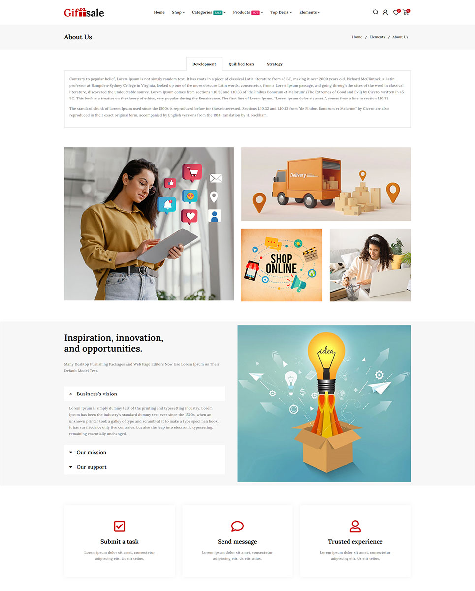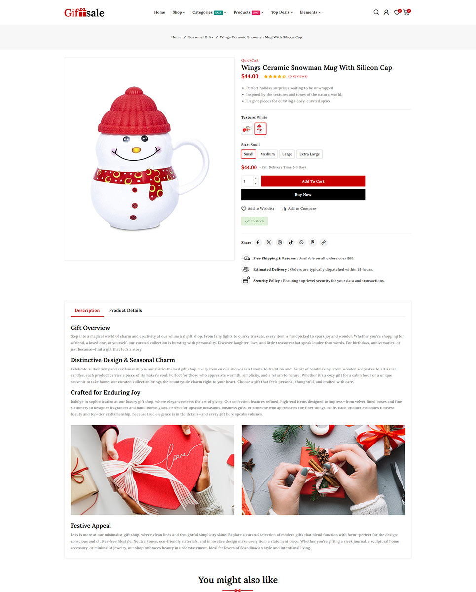 With responsive design, SEO optimization, and multi-language and currency support, Giftsale ensures your store looks beautiful and performs flawlessly on any device and in any region. The included Quickstart package allows you to set up your shop quickly with demo data.