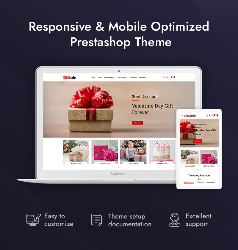 Giftsale - Online Gift Shop PrestaShop Responsive Theme is a stylish and modern eCommerce solution crafted for gift stores, boutiques, and lifestyle shops. Perfect for selling personalized gifts, greeting cards, flowers, accessories, and festive products, this theme helps you create a charming and engaging online store that delights customers at first glance.