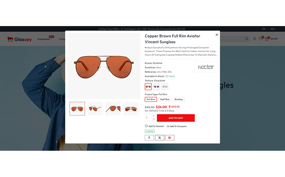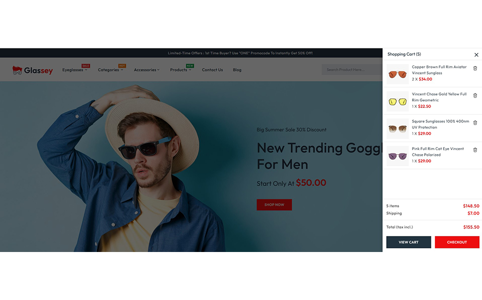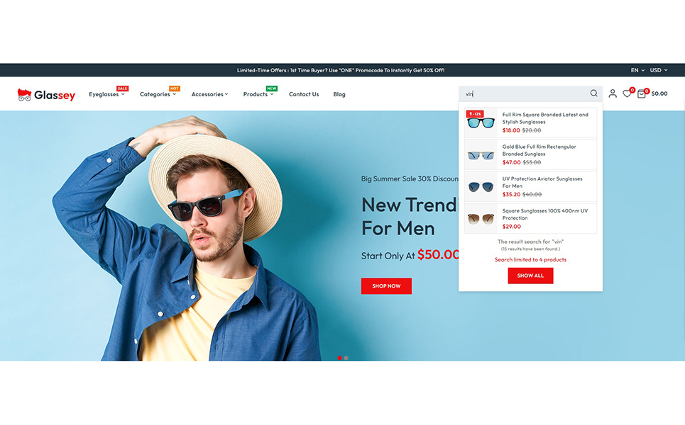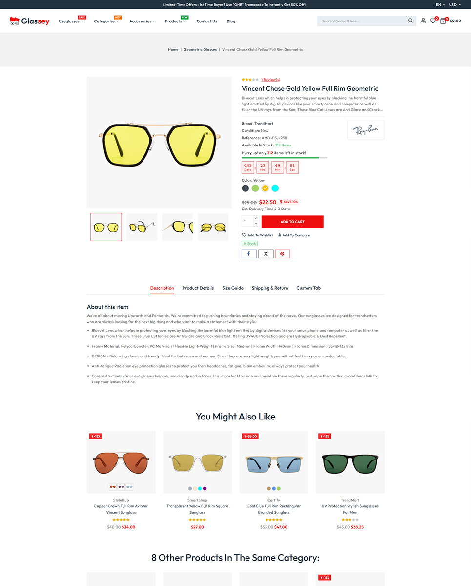 Glassey includes a highly efficient advanced filtering system that allows customers to narrow down their search based on attributes like brand, price, color, frame type, and more. The Ajax search functionality offers instant and dynamic search results as users type, delivering accurate product suggestions without the need to reload the page.