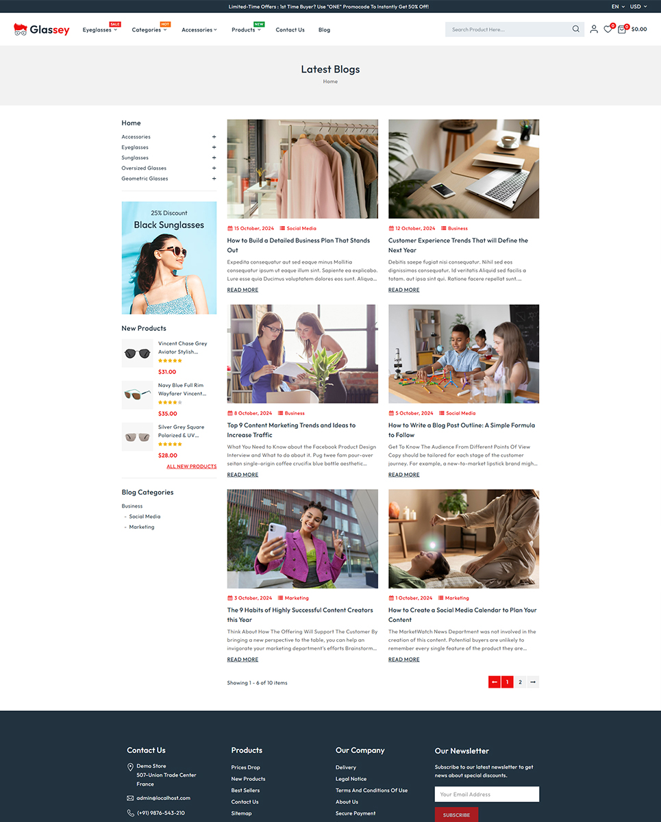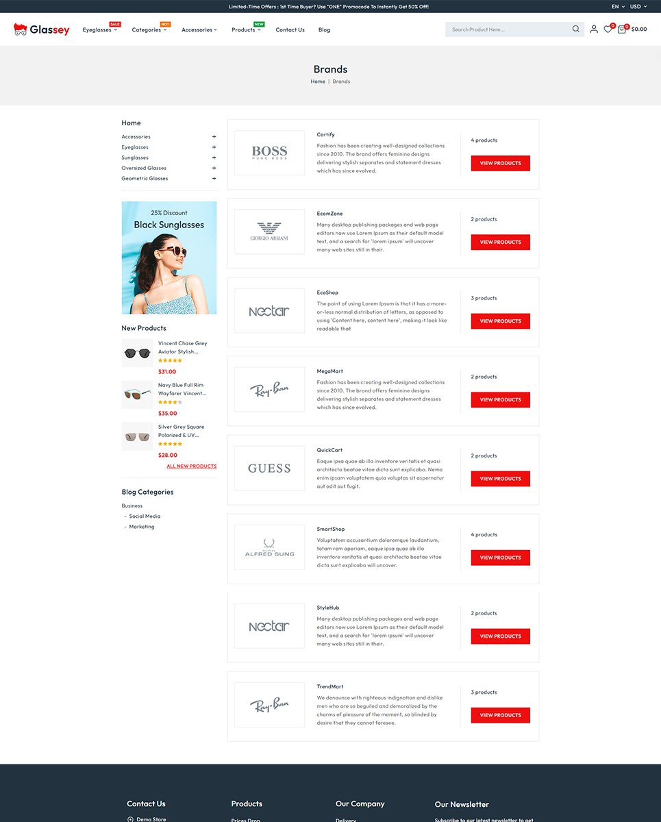 Glassey is a sleek and stylish PrestaShop responsive theme tailored specifically for online stores selling eyewear such as glasses, goggles, sunglasses, and related accessories. With its modern design and user-friendly features, Glassey offers a seamless shopping experience, ensuring your customers can browse and shop effortlessly.