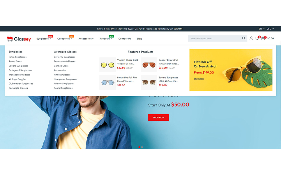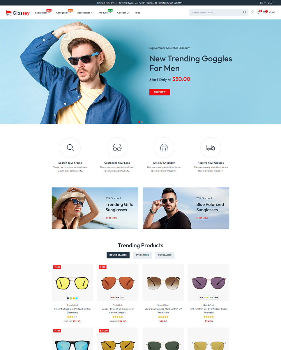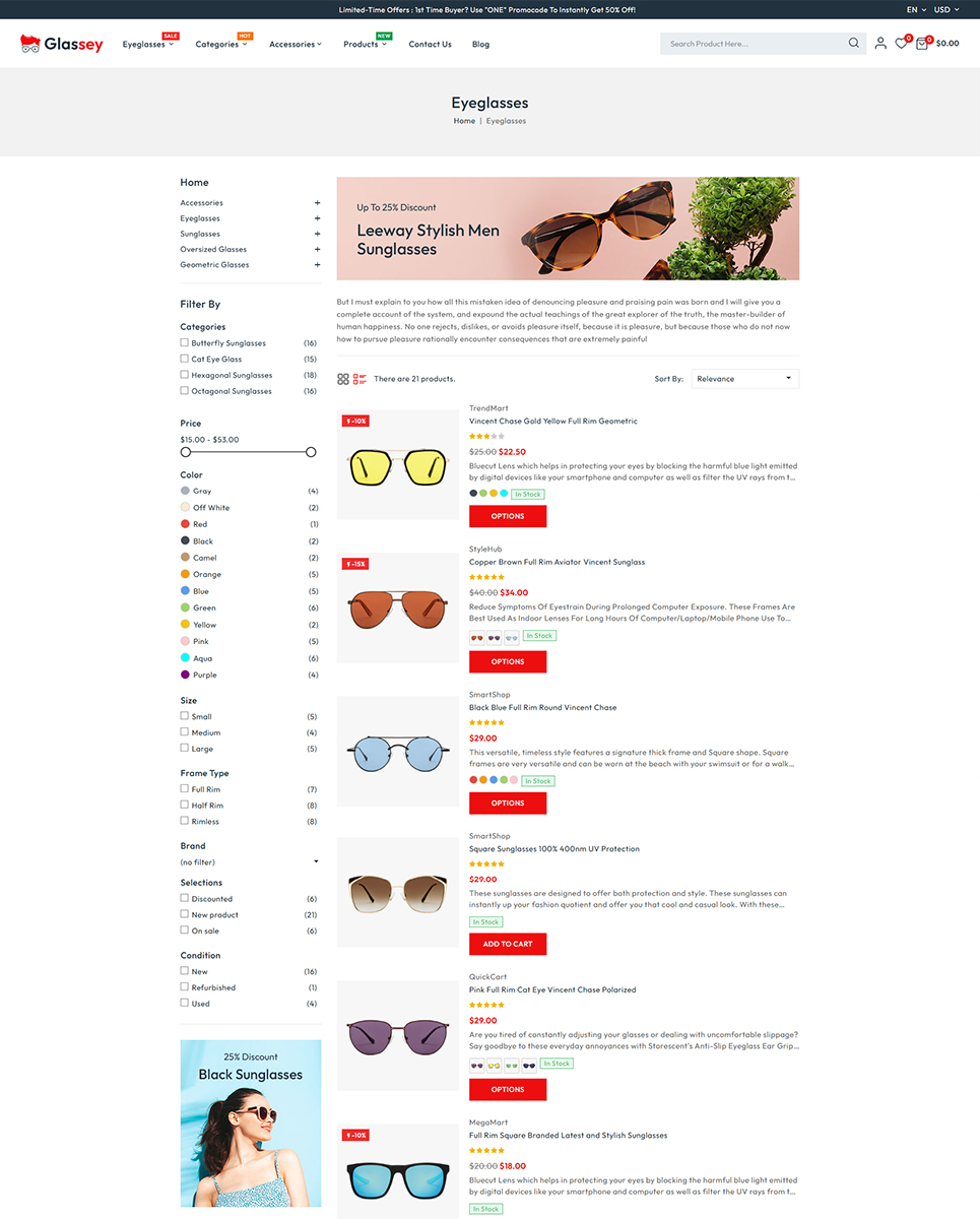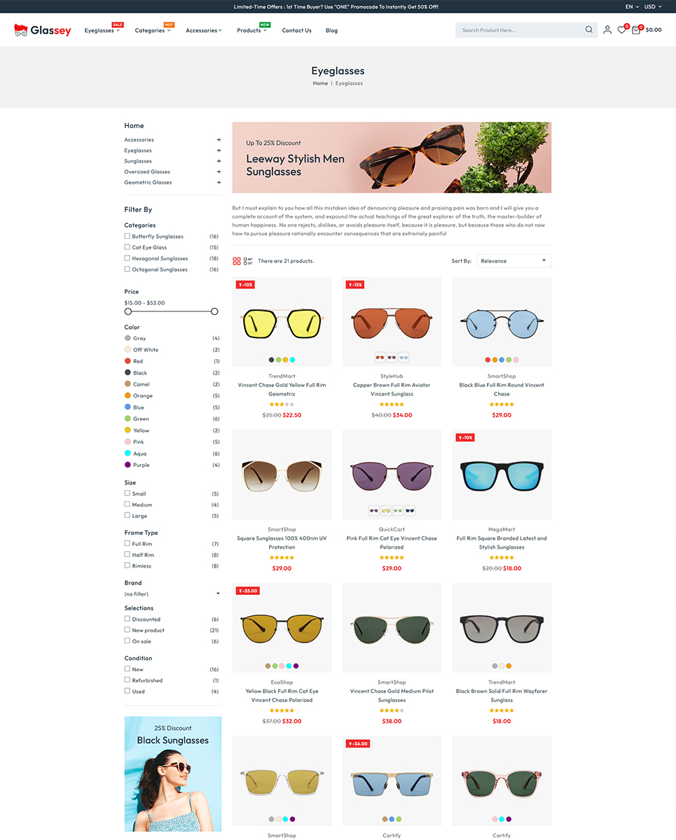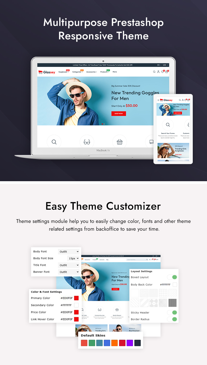 A clean and contemporary layout with a focus on showcasing eyewear products. The elegant design makes your products the center of attention. With customize theme option, Glassey lets you design a store that reflects your brand identity. Easily change colors, fonts, and box/full width layout to suit your preferences.