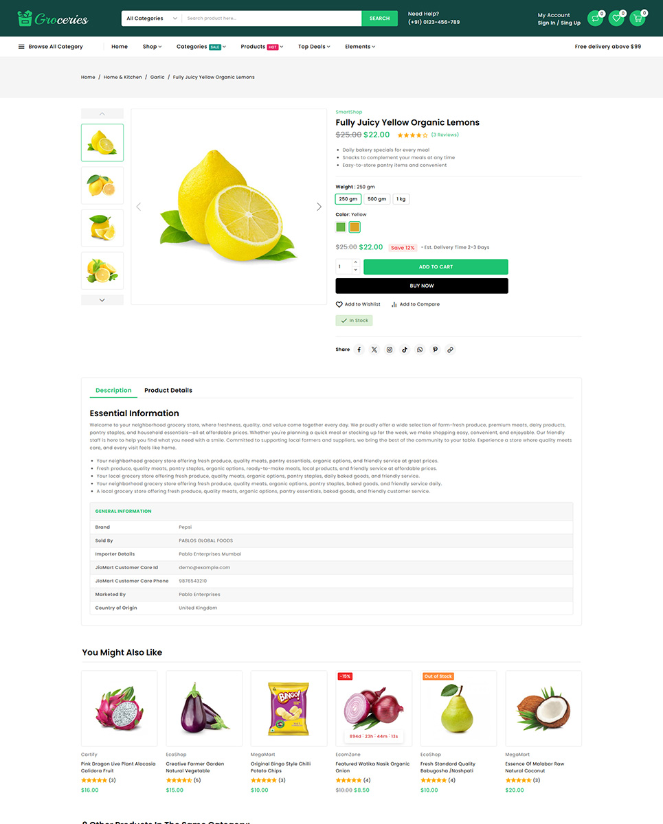 Groceries is fully responsive, ensuring your store looks attractive and functions smoothly on mobile devices, tablets, and desktops. The theme also integrates helpful shopping features such as quick view, wishlist, product comparison, and AJAX add to cart, which enhance user convenience and support faster decision-making.