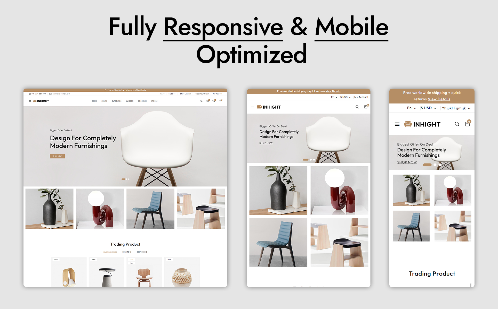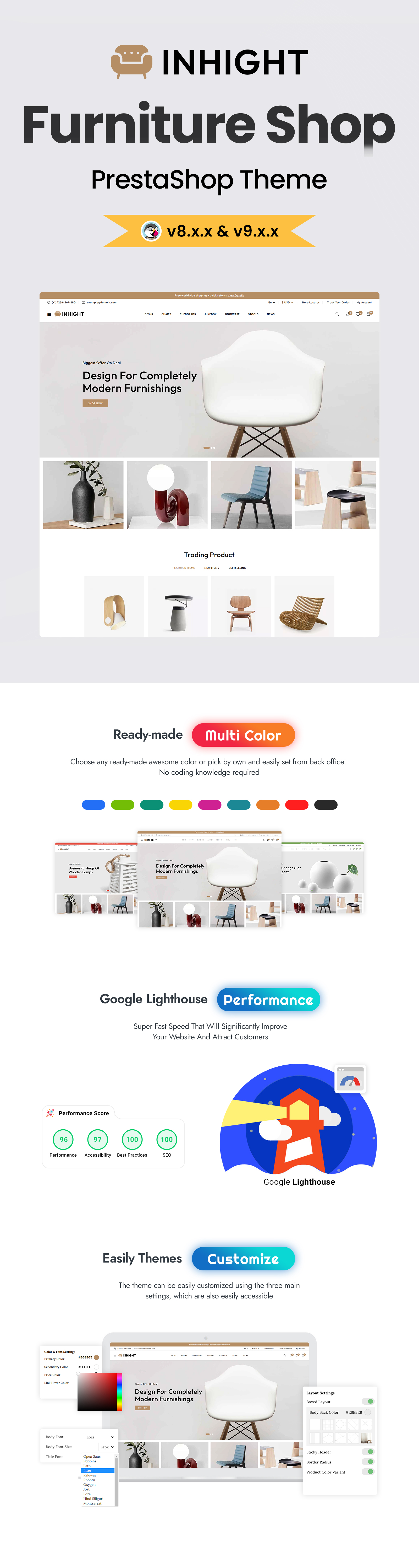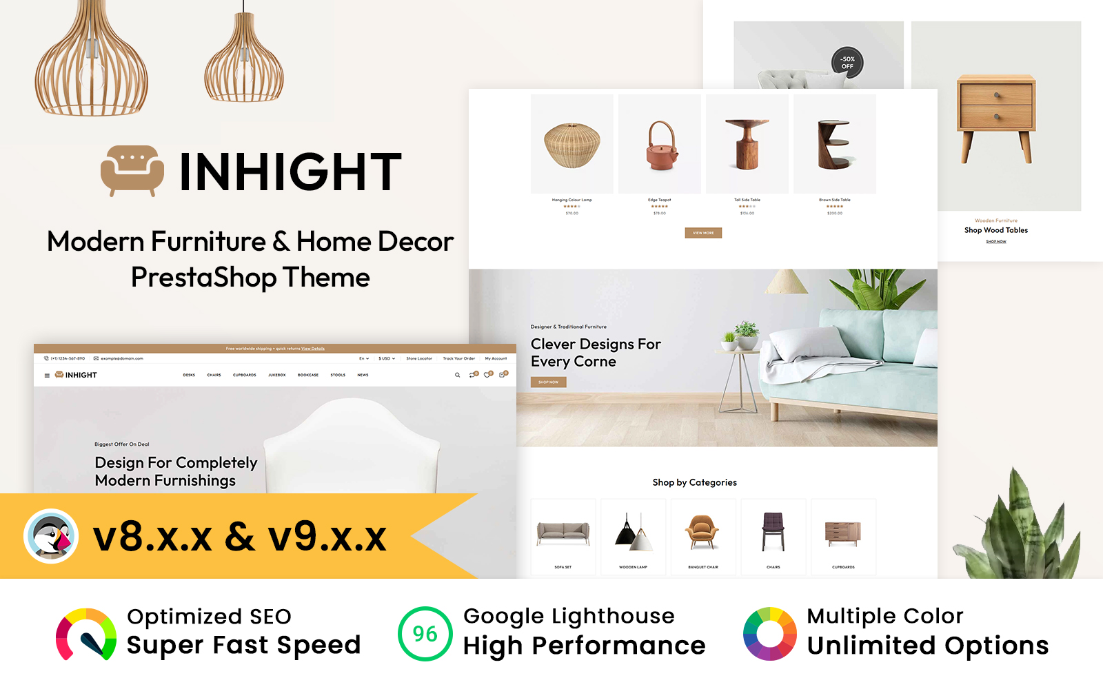 Interior Design & Furnishings in High Style The PrestaShop theme is made for stylish online stores that provide products associated with furniture, home décor, and interior design. Its sleek, modern design perfectly highlights decorative pieces, furniture collections, and interior design elements. A seamless and satisfying purchasing experience is guaranteed by the easy integration with PrestaShop. Designed to be very customizable, it provides adaptable designs, excellent picture galleries, and product fast views to effectively present your products. Because the InHight theme is entirely responsive, it will always look great on all kinds of devices. Furniture merchants looking to increase their online presence and sales will find it perfect due to its SEO optimization and quick loading speeds, which improve exposure.