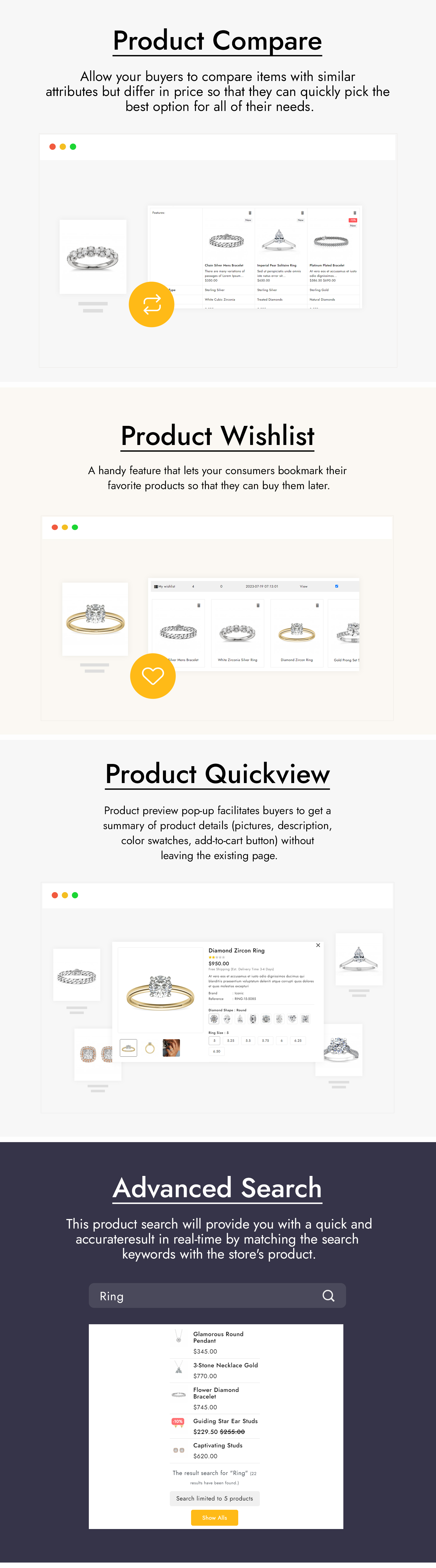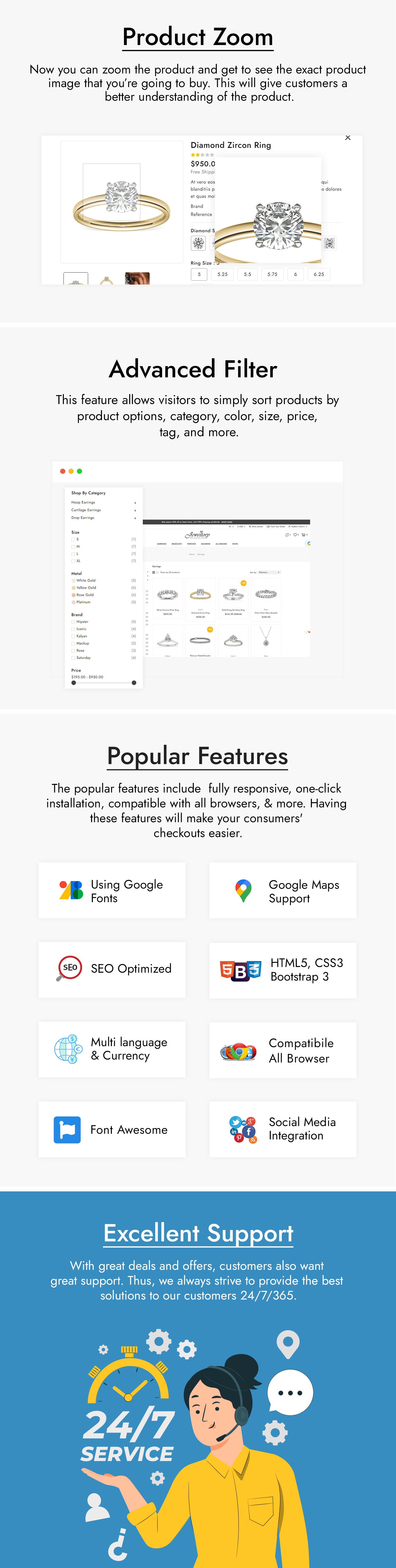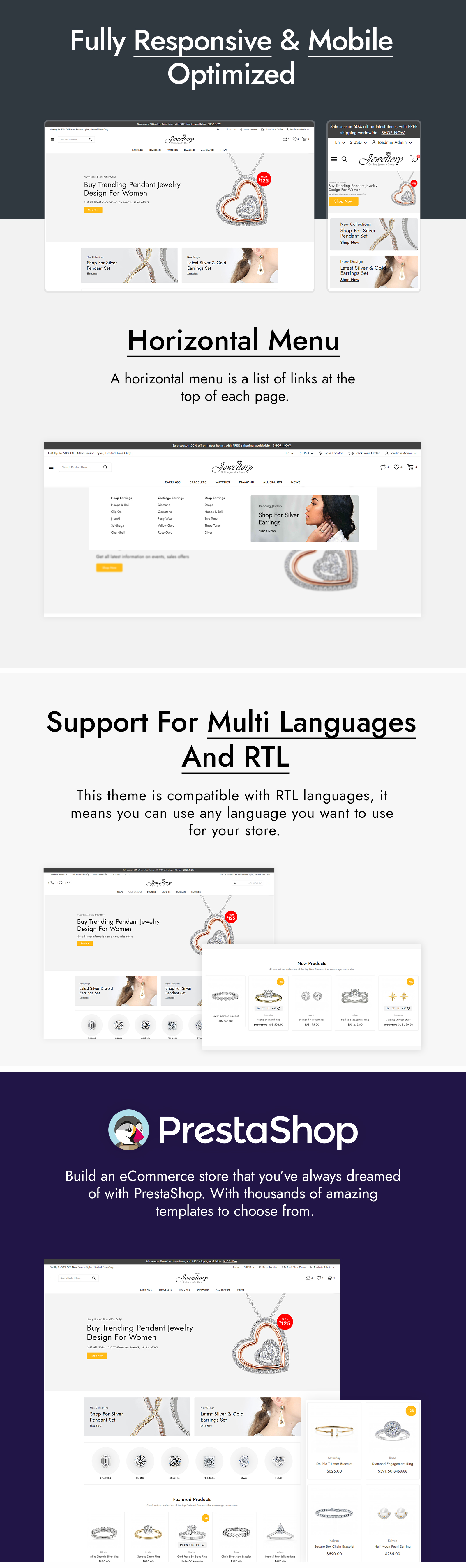 With our Jeweitory Jewelry PrestaShop Theme, experience the height of elegance and sophistication. Jeweitory theme designed to garnish your web-based company with brilliance, seamlessly blends user-friendly functionality with alluring aesthetics. As customers enjoy a captivating shopping experience surrounded by the appeal of priceless gems and stunning designs, you may take the jewelry company you have to new heights. Use your jewelry collection to its maximum potential to see success for your business on the internet.