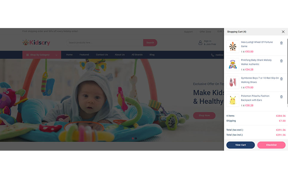 KidsCry comes with a Quickstart Installation Package, helping you set up the store quickly and replicate the demo in just a few clicks. The integrated Mega Menu Builder allows you to organize categories like toys, clothing, accessories, and collections in a simple and intuitive way. With AJAX-powered features such as product filters, smart search, quick view, and cart updates, the theme provides a fast and smooth user experience.