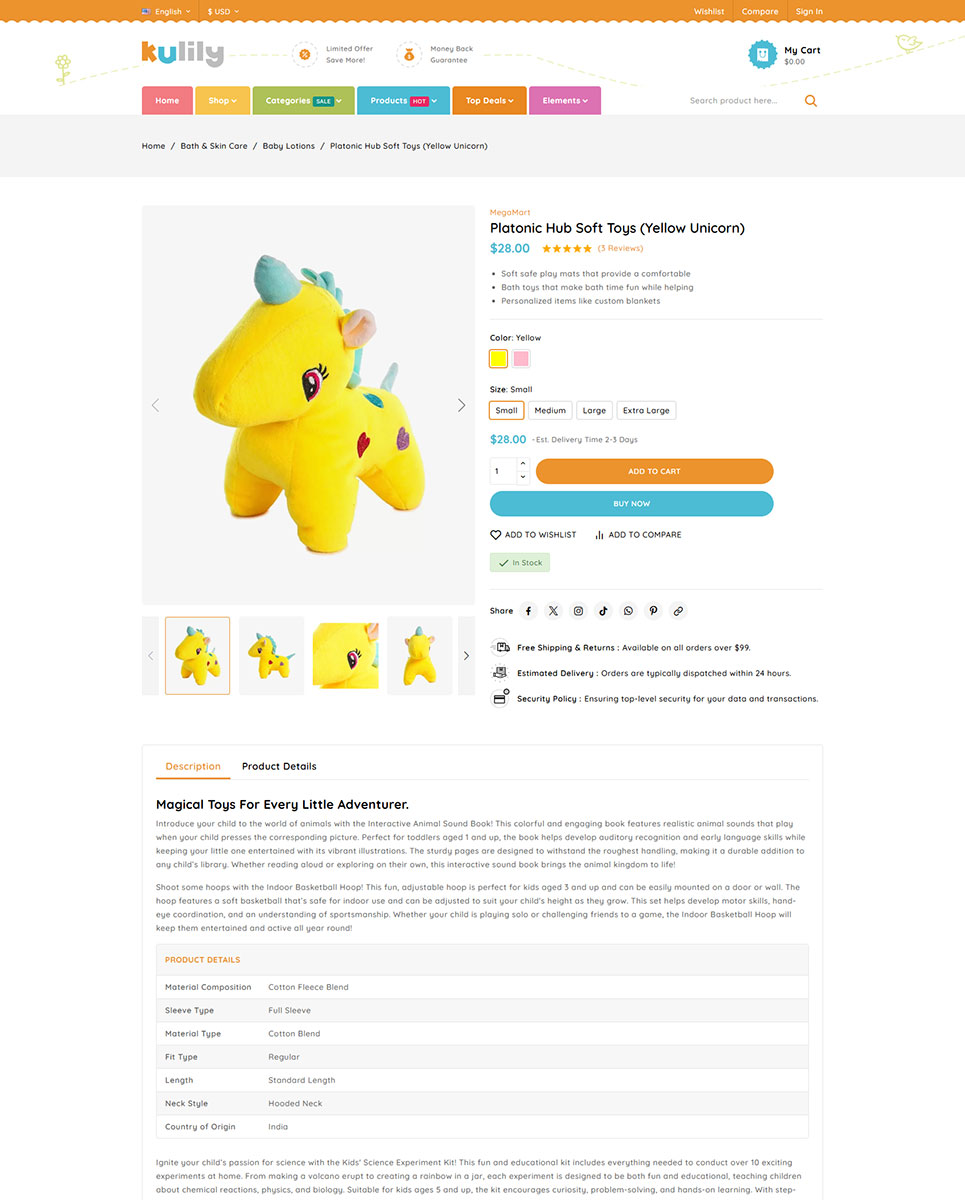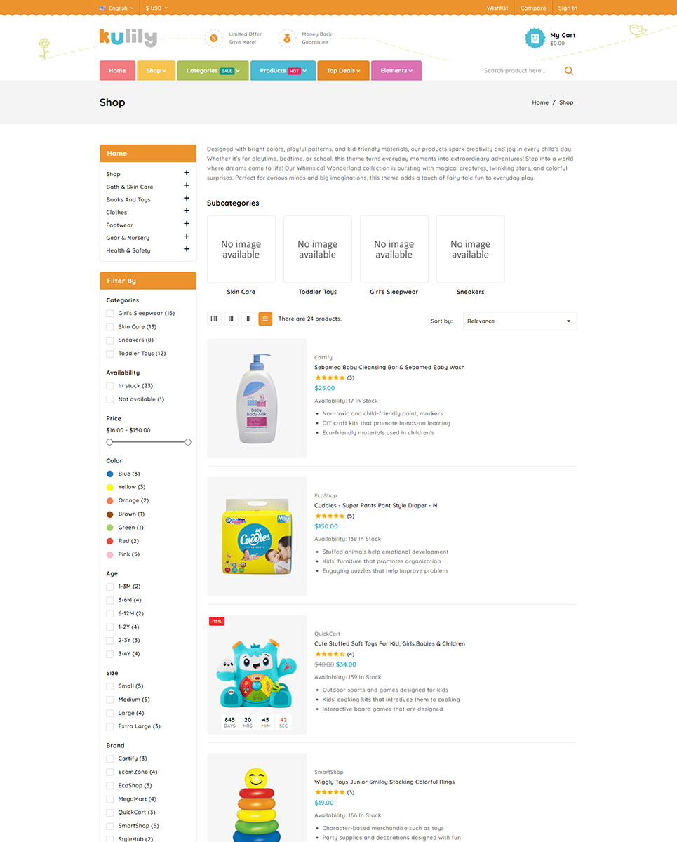 The powerful Mega Menu gives you the flexibility to organize products by age group, clothing type, toys categories, educational games, baby accessories, and more—making navigation easy and intuitive for customers. Fully responsive, Kulily adapts beautifully across mobile phones, tablets, and desktops, providing a consistent and enjoyable shopping experience on every device.