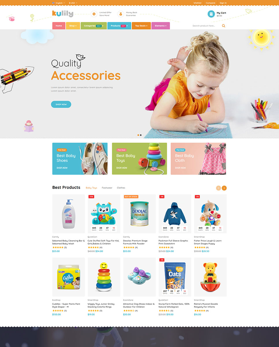 Kulily – Kids Fashion & Toys Store PrestaShop Responsive Theme is a playful, vibrant, and beautifully designed eCommerce theme specially crafted for online kids’ clothing shops, baby fashion boutiques, toys & games stores, and children’s accessories retailers. With its cheerful color palette, soft typography, and friendly layout structure, Kulily creates a fun and delightful shopping atmosphere that appeals to both children and parents.