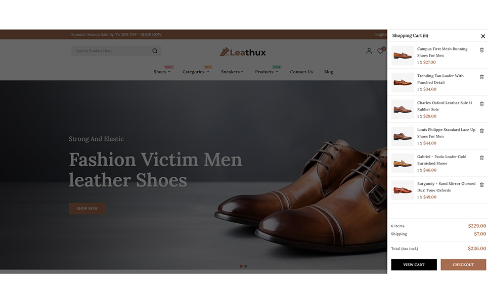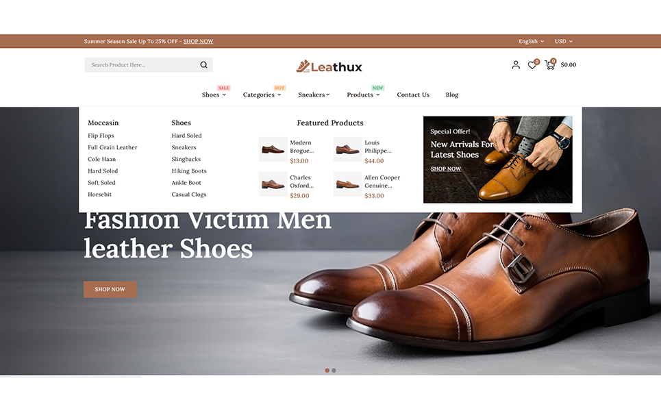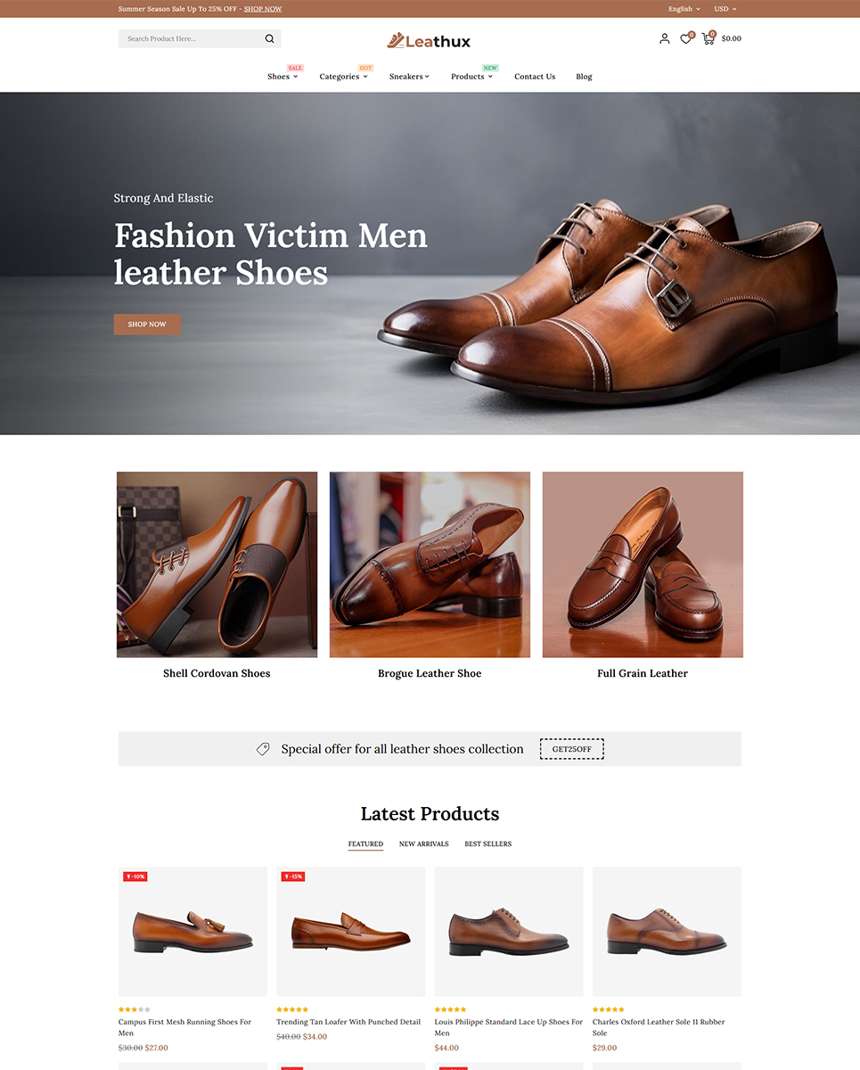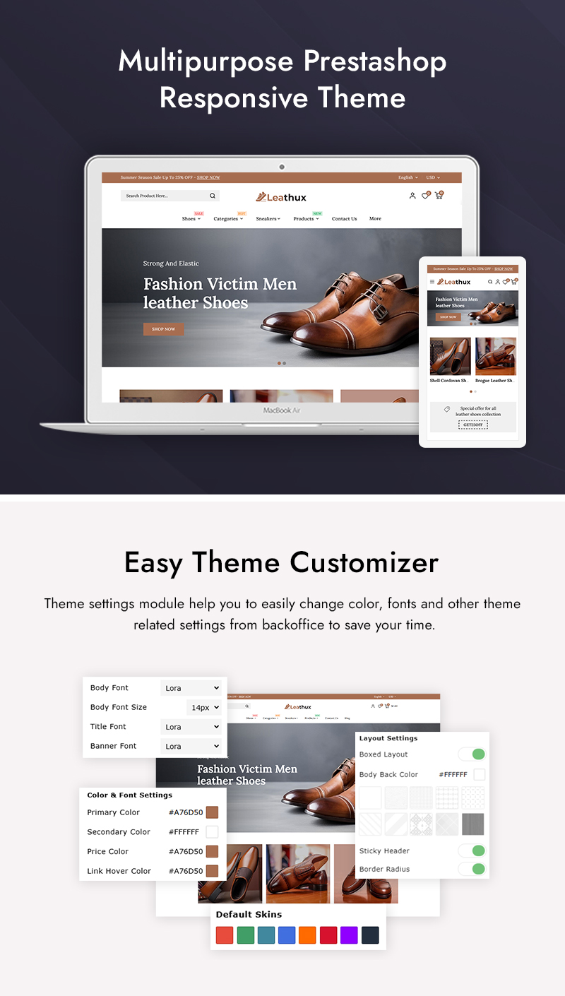 Leathux - Leather Shoes and Footwear Store PrestaShop Responsive Theme is a sleek, sophisticated, and fashion-forward theme crafted exclusively for online footwear retailers. Whether you're selling luxury leather shoes, casual sneakers, boots, sandals, or designer accessories, Leathux offers the perfect digital storefront to elevate your brand and captivate customers.