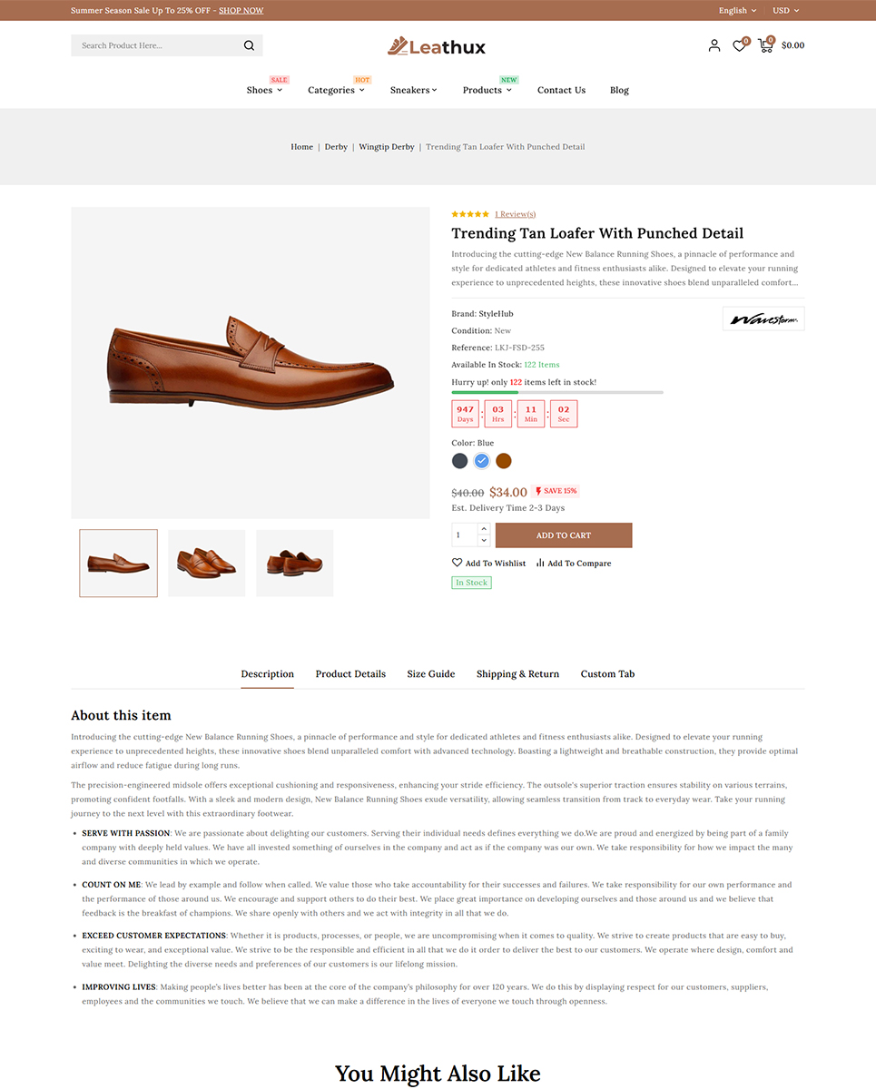 - Additional Tabs on Product Detail Page (Shipping & Return, Size Guide and Custom Tab)