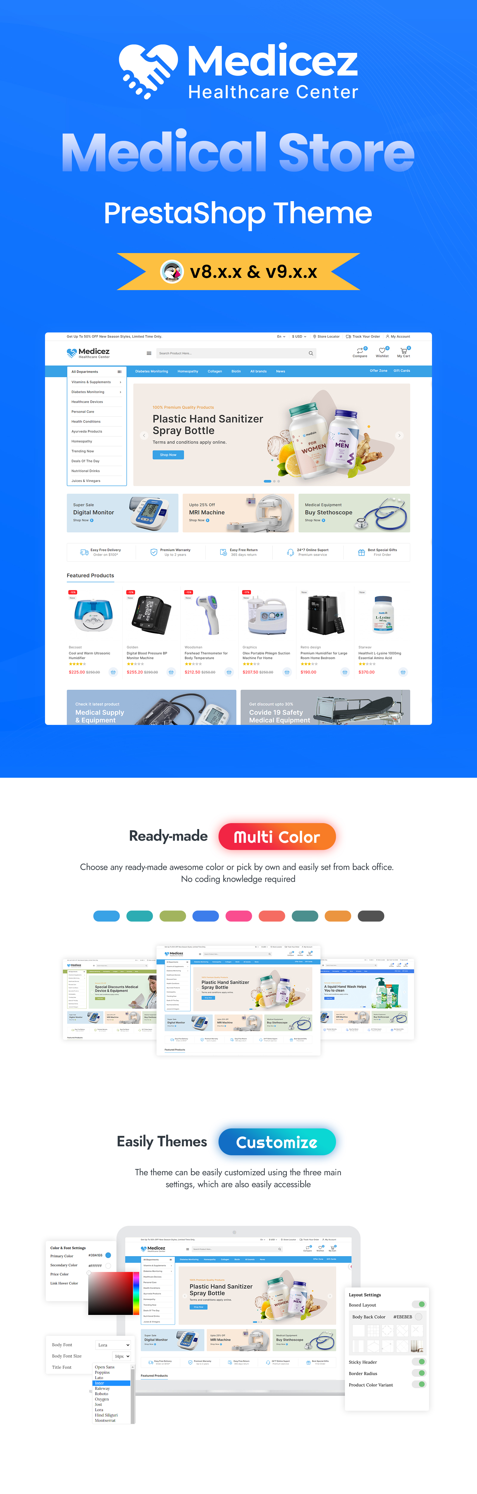 If you are looking simple PrestaShop theme that will be work for pharmacy, hospital, or medical-related? Medicez theme might be best choice available. With its contemporary features and appearance, the flexible Medicez theme may easily attract the user's attention on your website. Additionally, the Medicez theme contains clean code, which will make it possible for your website to load more quickly. Users on your website will locate their preferred products quickly thanks to the simple navigation, sophisticated search, and numerous product categories and features. Also you will have a thorough guide that help you install theme very easily!