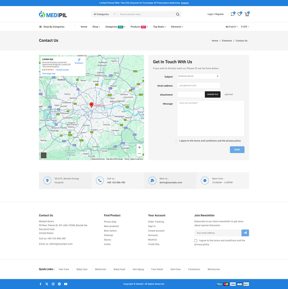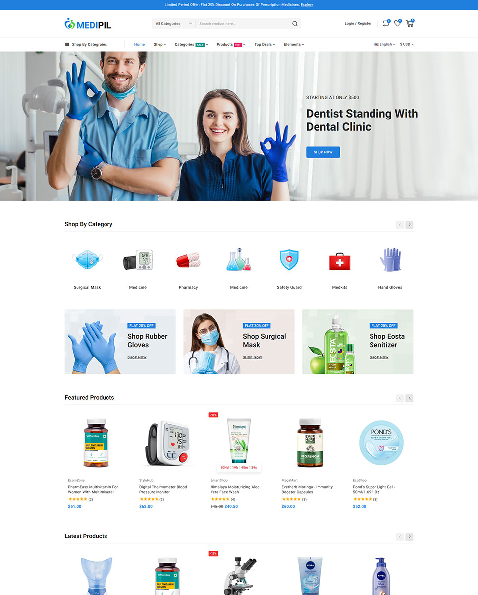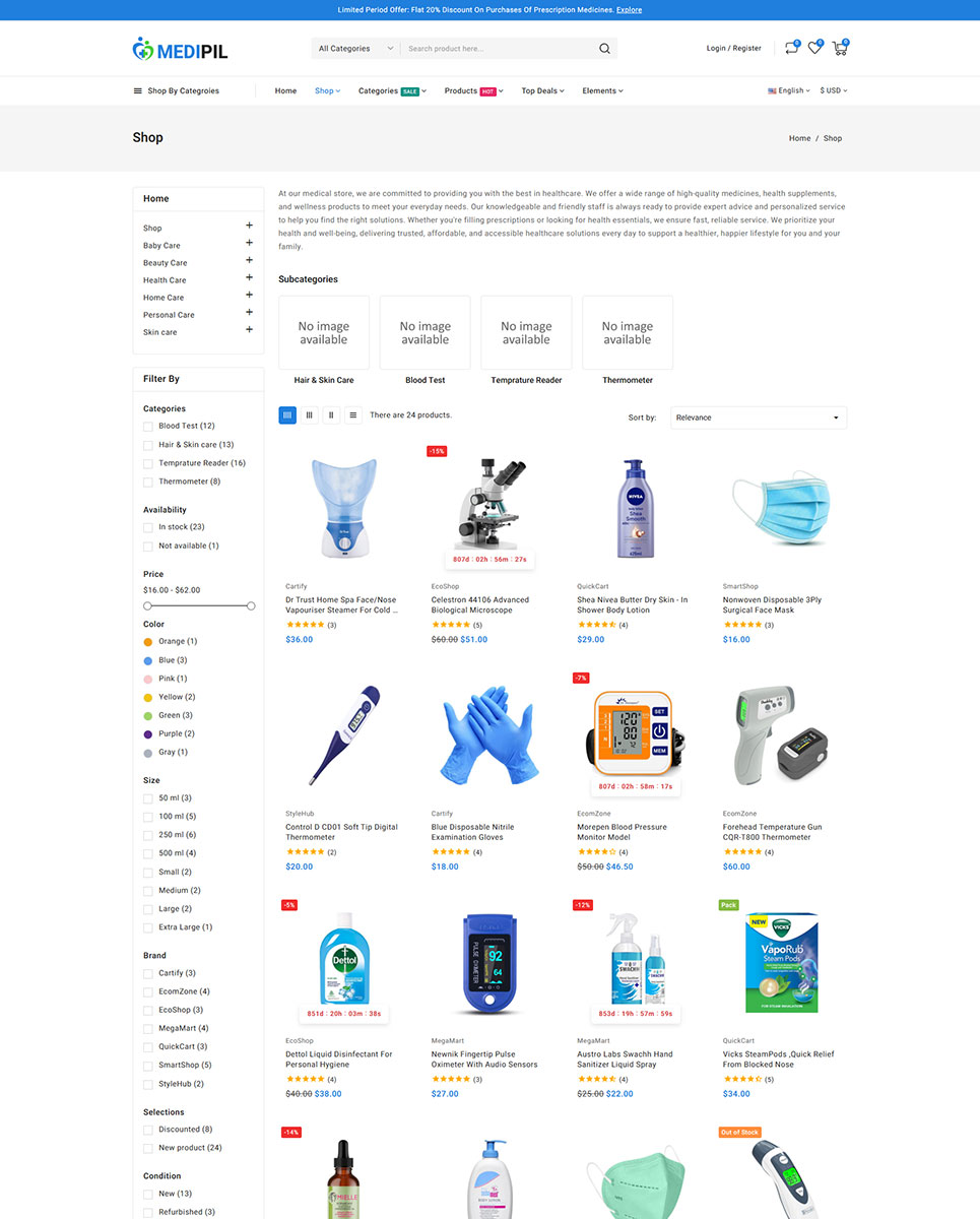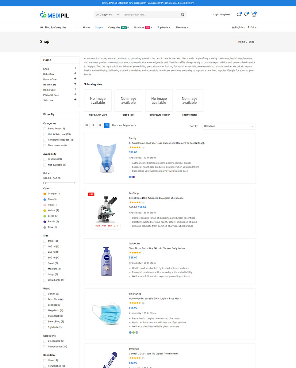 Medipil is a clean, reliable, and professionally designed PrestaShop Responsive Theme created especially for medical stores, pharmacies, health care shops, wellness centers, medical equipment suppliers, and online drugstores. The theme focuses on clarity, trust, and convenience—elements that are essential for stores offering health-related products. With its organized layout and minimal styling, Medipil allows customers to browse medicines, supplements, medical devices, personal care items, and health essentials in a straightforward and reassuring environment.