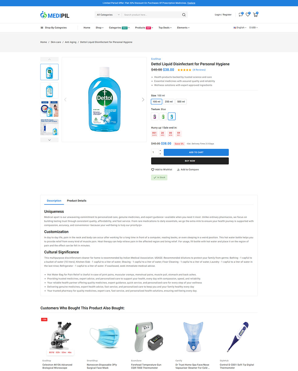 Medipil is fully responsive, ensuring seamless display and functionality across desktops, tablets, and mobile devices. The theme integrates useful features like quick view, wishlist, compare, and AJAX add to cart, which make the shopping process smoother and faster. Customers can explore, select, and purchase products without page reloads, improving user experience and increasing conversions.