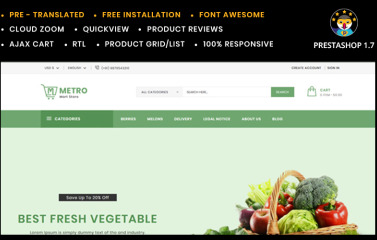 Metromart Prestashop Responsive Theme is designed for groceries, vegetables, food, fashion, clothes, gifts, electronics, computer, accessories, auto parts, construction tools, garden tools, mobile, vegetables, food, and multipurpose stores. All subpages are designed. The Metro Prestashop Theme is looking good with color combinations. Theme layouts are specially categorized with the main online grocery stores, and the theme has a clean and professional look.