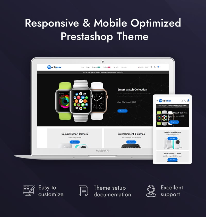 Optimized for speed, SEO, and conversions, Mobiemax includes a quickstart installation package, so you can launch your electronics store in minutes. Whether you’re selling top-brand mobiles, tech gadgets, or smart home devices, Mobiemax combines modern design, flexibility, and powerful functionality to help your business stand out in the fast-paced electronics market.