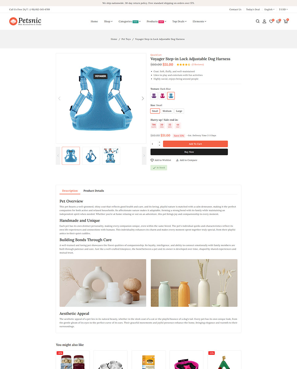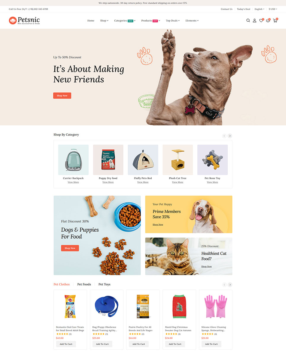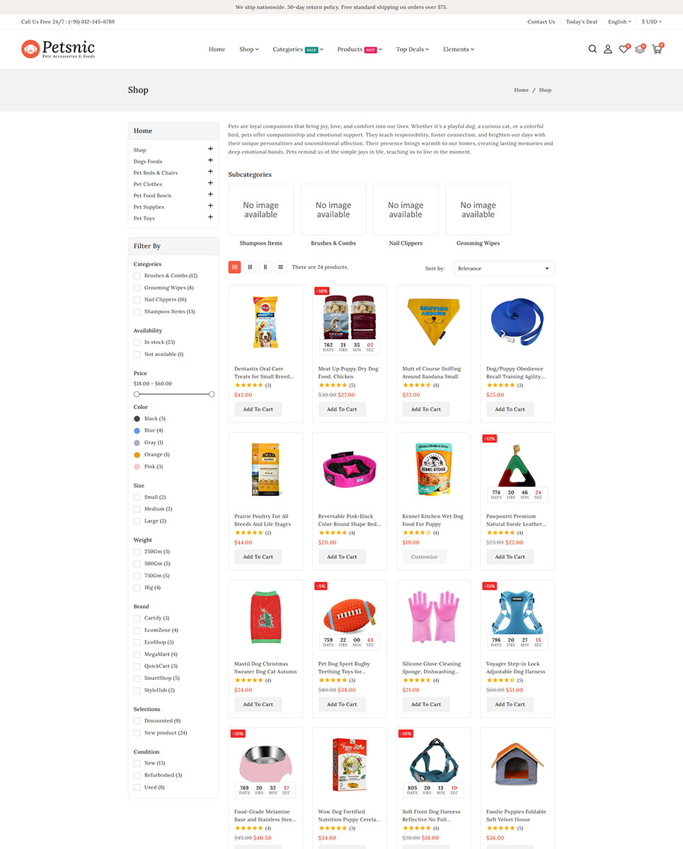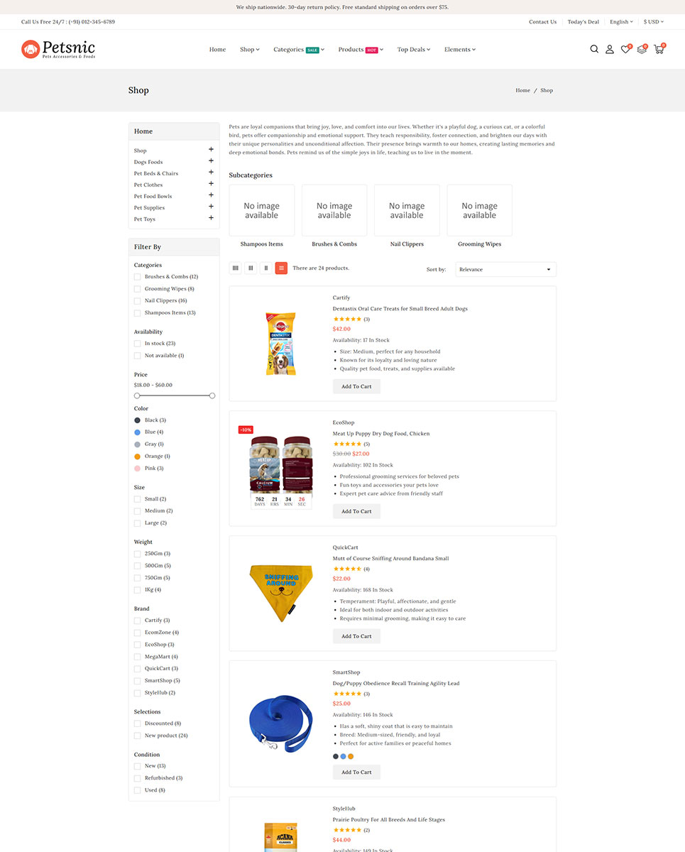 Petsnic includes powerful Ajax-based features like advanced search, product filters, quick view, wishlist, and add-to-cart options that make shopping fast and enjoyable. The mega menu, attractive sliders, and product carousels help you showcase categories such as pet food, toys, grooming kits, and health products in an organized and visually appealing way.