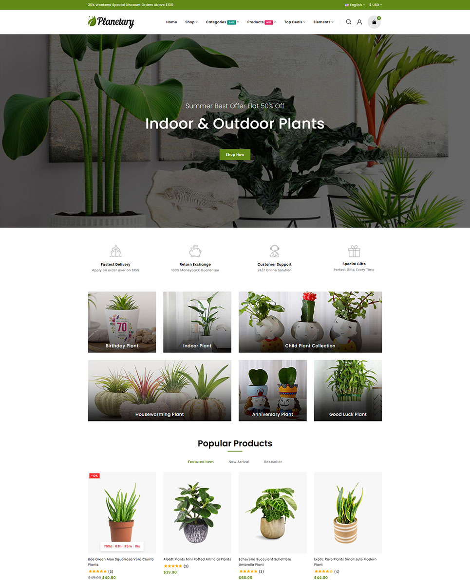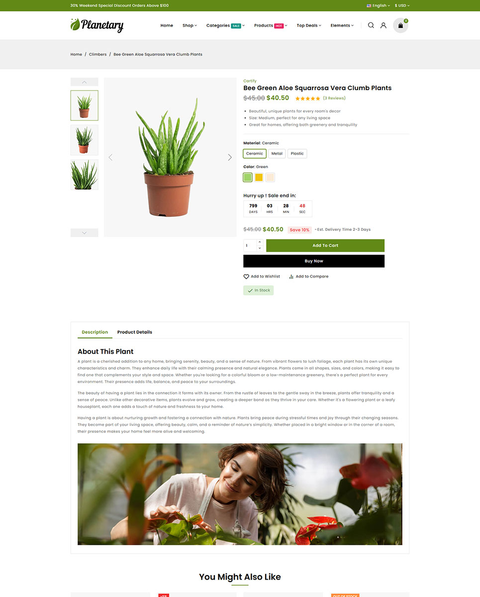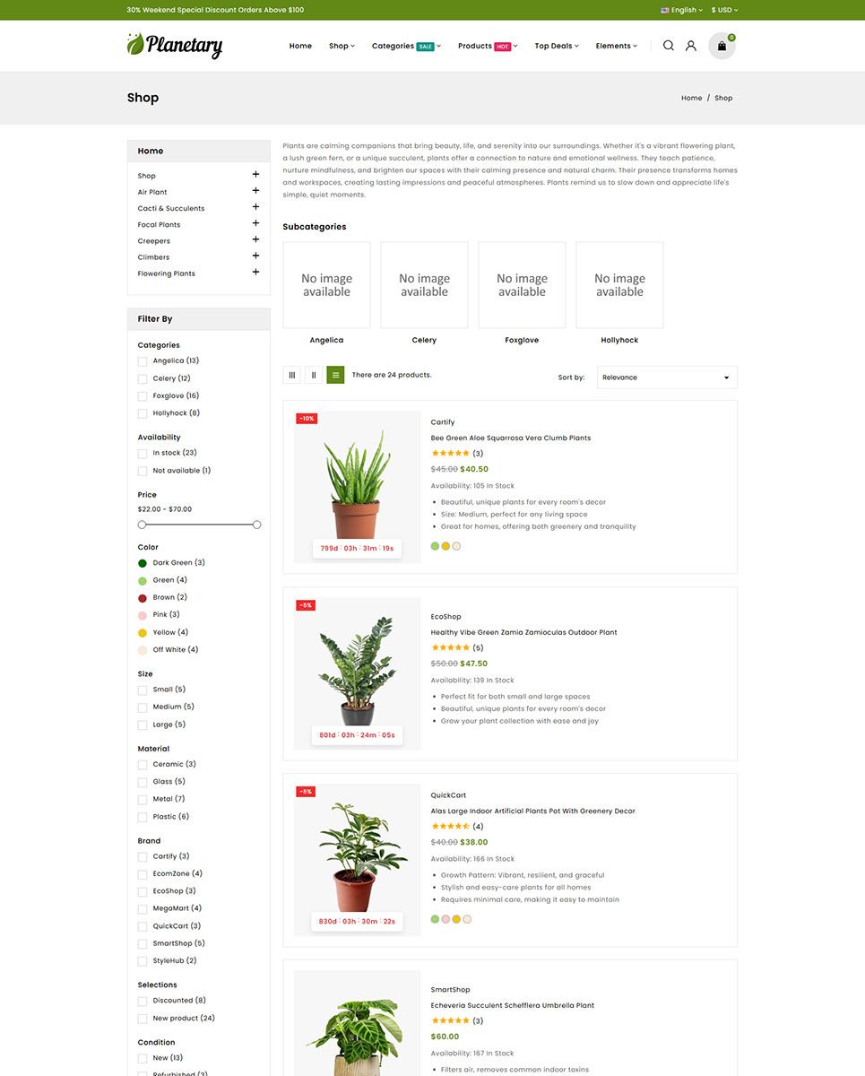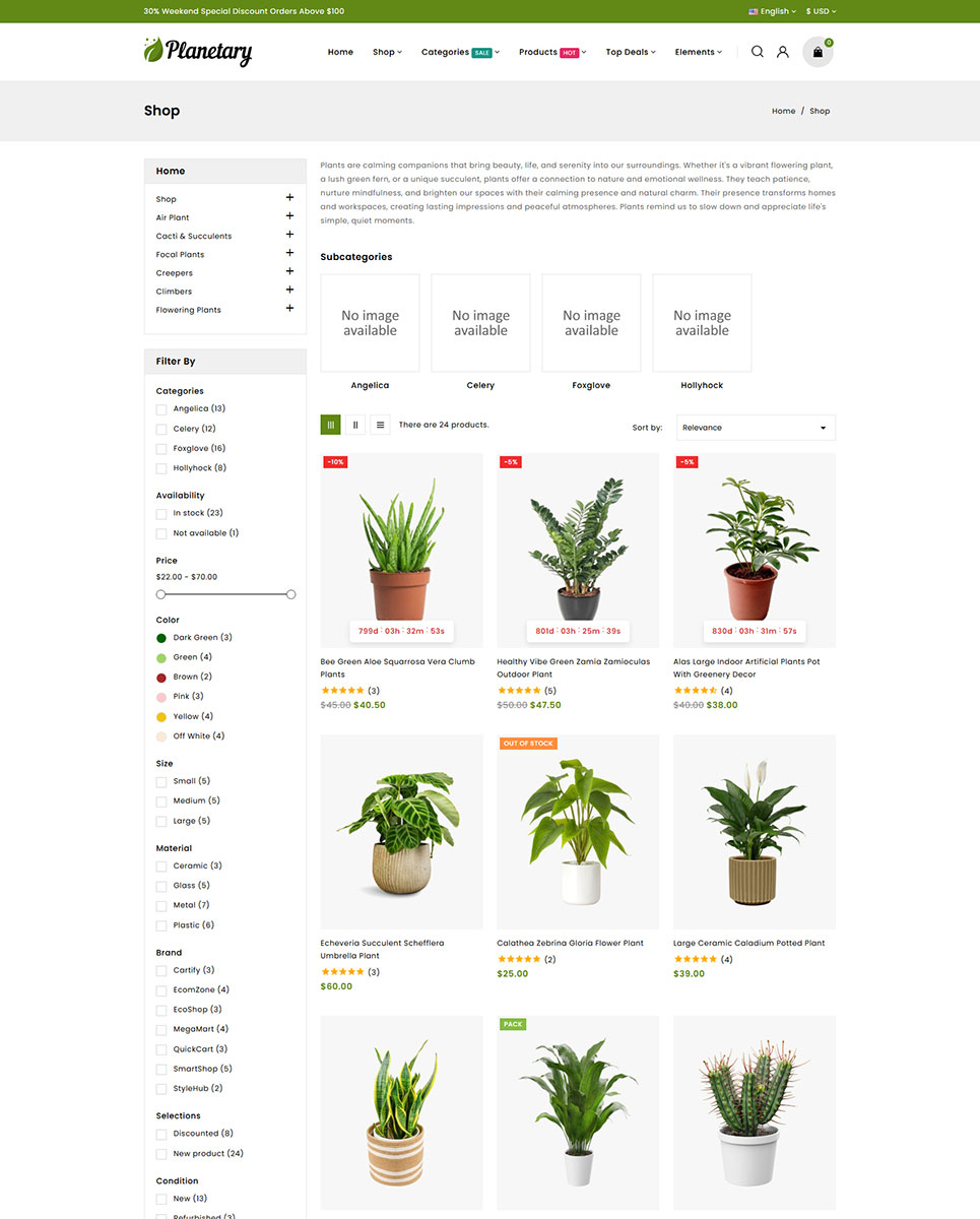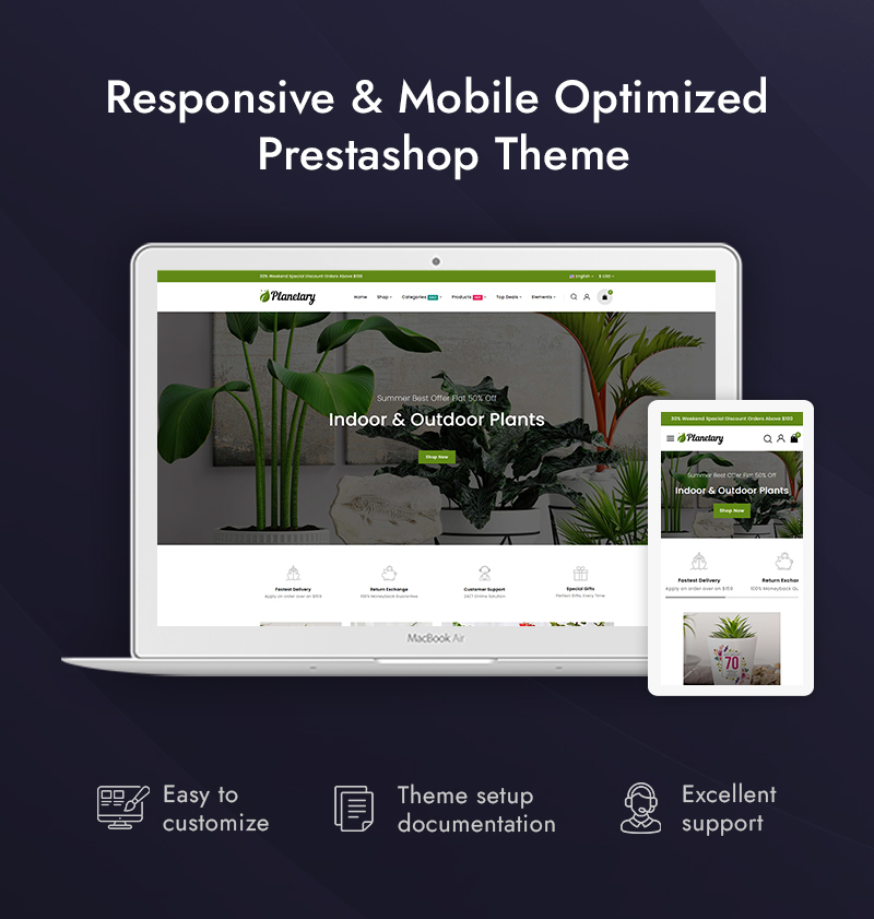 Planetary – Plants & Nursery Store PrestaShop Responsive Theme is a fresh, nature-inspired and beautifully crafted eCommerce theme designed for plant nurseries, gardening shops, indoor plant sellers, flower boutiques, landscaping supply stores, and eco-friendly lifestyle brands. With its calm color palette, soft typography, and spacious layout, Planetary provides a soothing and organic shopping experience that complements botanical products perfectly.